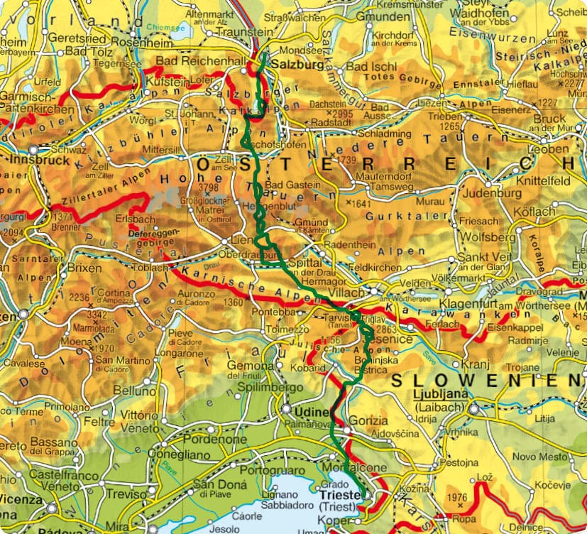 Diese Alpenüberquerung von Salzburg nach Triest führt durch Österreich, Deutschland, Slowenien und Italien. Auf rund 500 Kilometern erlebt man sieben Gebirgsgruppen und durchquert drei berühmte Nationalparks: den Nationalpark Berchtesgaden, den Nationalpark Hohe Tauern und den Triglav-Nationalpark in den Julischen Alpen.