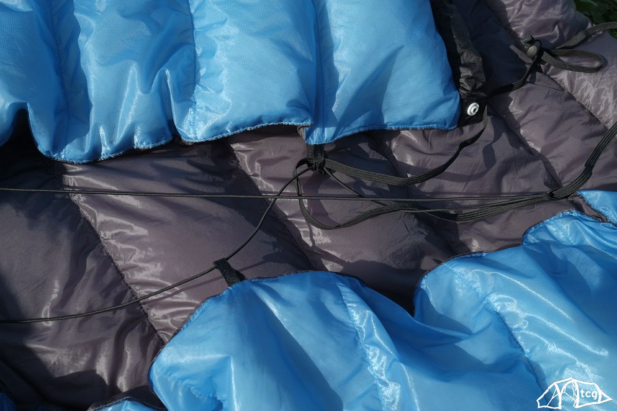 Der erste Eindruck war verblüffend. Dieser Quilt wiegt fast nichts (312 g) und soll einen Komfortbereich bis +3 °C abdecken? Der Fußbereich ist bis auf Kniehöhe rundum geschlossen. Von den Knien bis zum Kopfende ist der Rücken offen. Damit der Schläfer an den Seiten nicht friert, halten Gummibänder den Quilt nah am Körper. Eventuelle Löcher, durch die warme Luft entweichen und kalte Luft eindringen könnte, werden dadurch zwar minimiert, aber nicht gänzlich verhindert. Ob es kuschlig warm oder hier und da zugig wird, liegt vor allem an deiner Aktivität in der Nacht.
