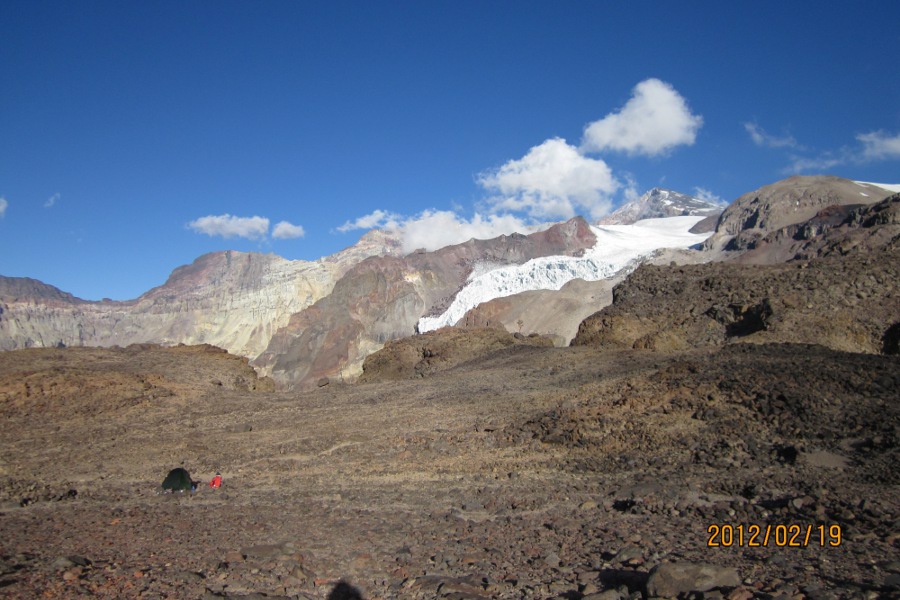 In sengender Sonne bewegte ich mich durch wegloses Geröll vulkanischen Ursprungs den sehr steilen Weg zu einem Pass hinauf, wo sich der Blick Richtung Norden öffnete. Ich zeltete auf 4200m Höhe. Die einzige Wasserquelle hier war ein riesiger Eiszapfen. Ich genoss die unglaubliche Ruhe und Einsamkeit. Der nächste Morgen war kalt und sonnig, aber es zeigten sich unter mir bereits Wolken. Nach dem Frühstück ging ich Richtung Osten durch unwegsames Terrain. Am Nachmittag traf ich auf ‚Zeltplätze‘ am Gletscherrand in ca. 5200m Höhe. Es gab Sturm und Hagel. Und als ich bereits im Schlafsack lag, bemerkte ich seltsame Lichtreflexionen an der Innenzeltwand, die von einem Gewitter unter mir in ein paar Kilometern Entfernung stammten.