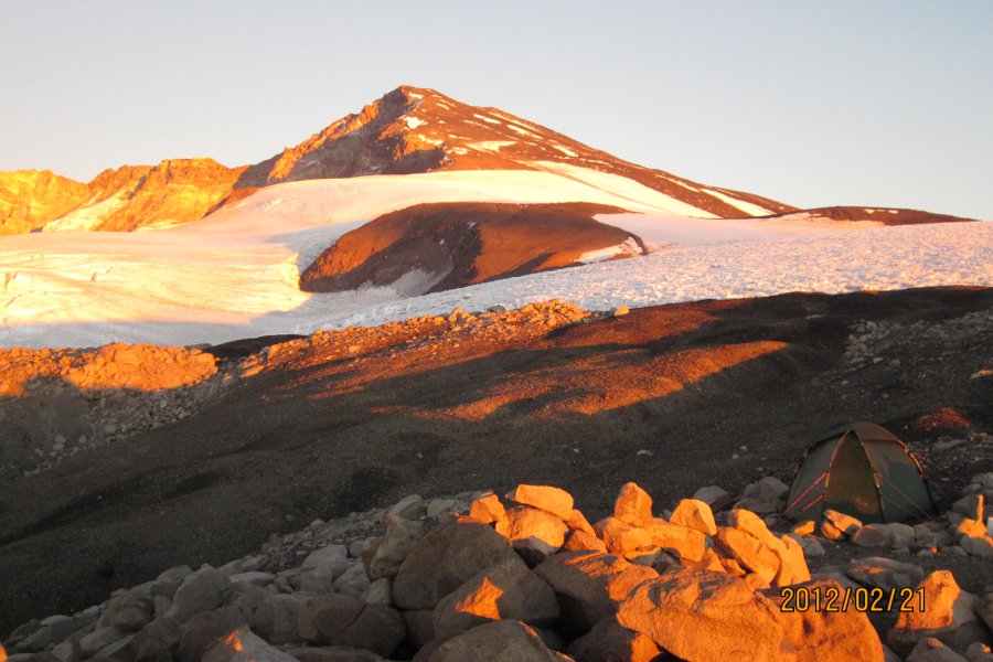 Die dünne Luft machte mir zu schaffen: Ich wurde langsamer, die Schritte kleiner, die Verschnaufpausen länger. Nach über 7 Stunden (und am fünften Tag der Tour) stand ich geschafft, aber glücklich, auf dem sturmumtosten eisigen Gipfel. Als ich wieder am Zelt ankam war es bereits später Nachmittag und ich kochte mir meine erste richtige Mahlzeit an diesem Tag.