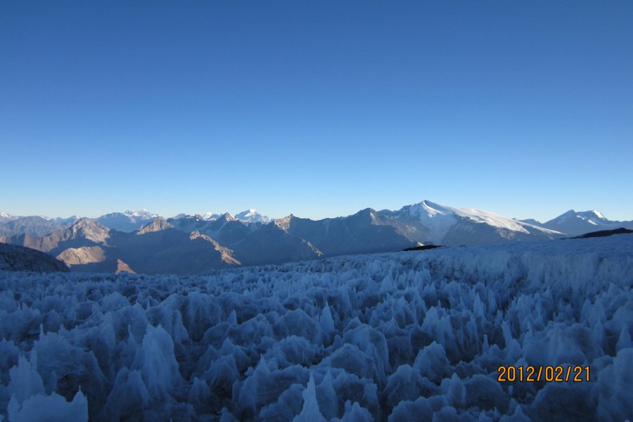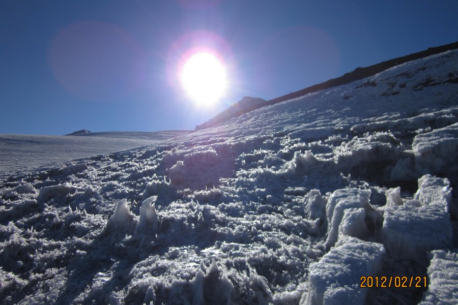 Einziges Symptom des schnellen Aufstiegs in relativ große Höhen war der unruhige Schlaf. Da sich der Himmel beim Verblassen der Sterne ungetrübt zeigte, beschloss ich, einen Gipfelsturm zu wagen. Ich machte mich vor Sonnenaufgang auf den Weg durch den eisigen Morgen über den spaltenreichen, von Eisnadelfeldern gespickten Gletscher. Irgendwann erreichte ich den eisfreien Gipfelgrat.