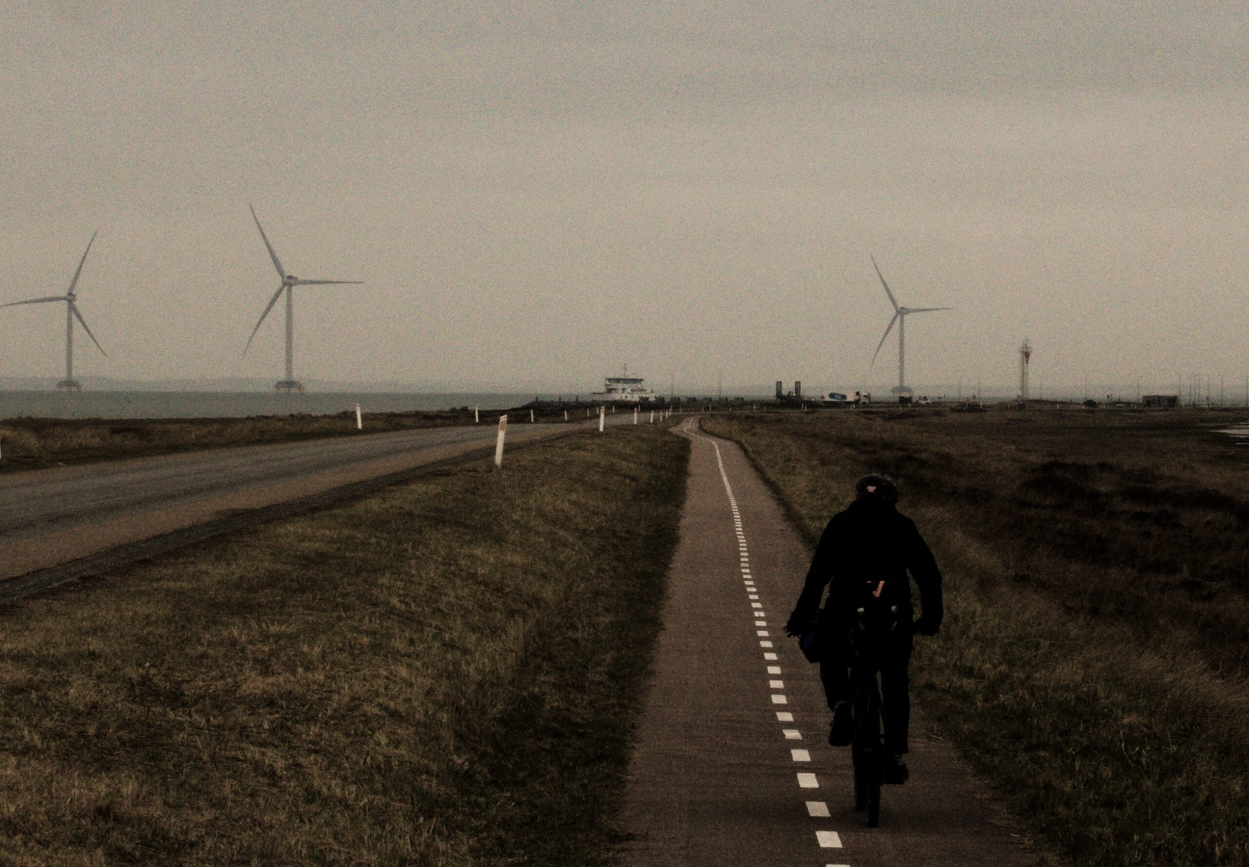 Die folgende Tour an der Westküste entpuppt sich als eine unerwartet wilde Jagd auf unsere Fähre, bei der wir uns vor allem dem Gegenwind auf dem exponierten Deich geschlagen geben müssen, während die Fähre höhnisch langsam ablegt. Auch das Wetter zeigt sich von seiner nassesten Seite, was uns zu einer kleinen aufwärmenden Völlerei bei Thyborøn zwingt. Hier esse ich das salzigste Essen meines Lebens und habe danach einen so bemerkenswerten Blutdruck, dass mir auch bis zum Abend nicht mehr kalt wird.