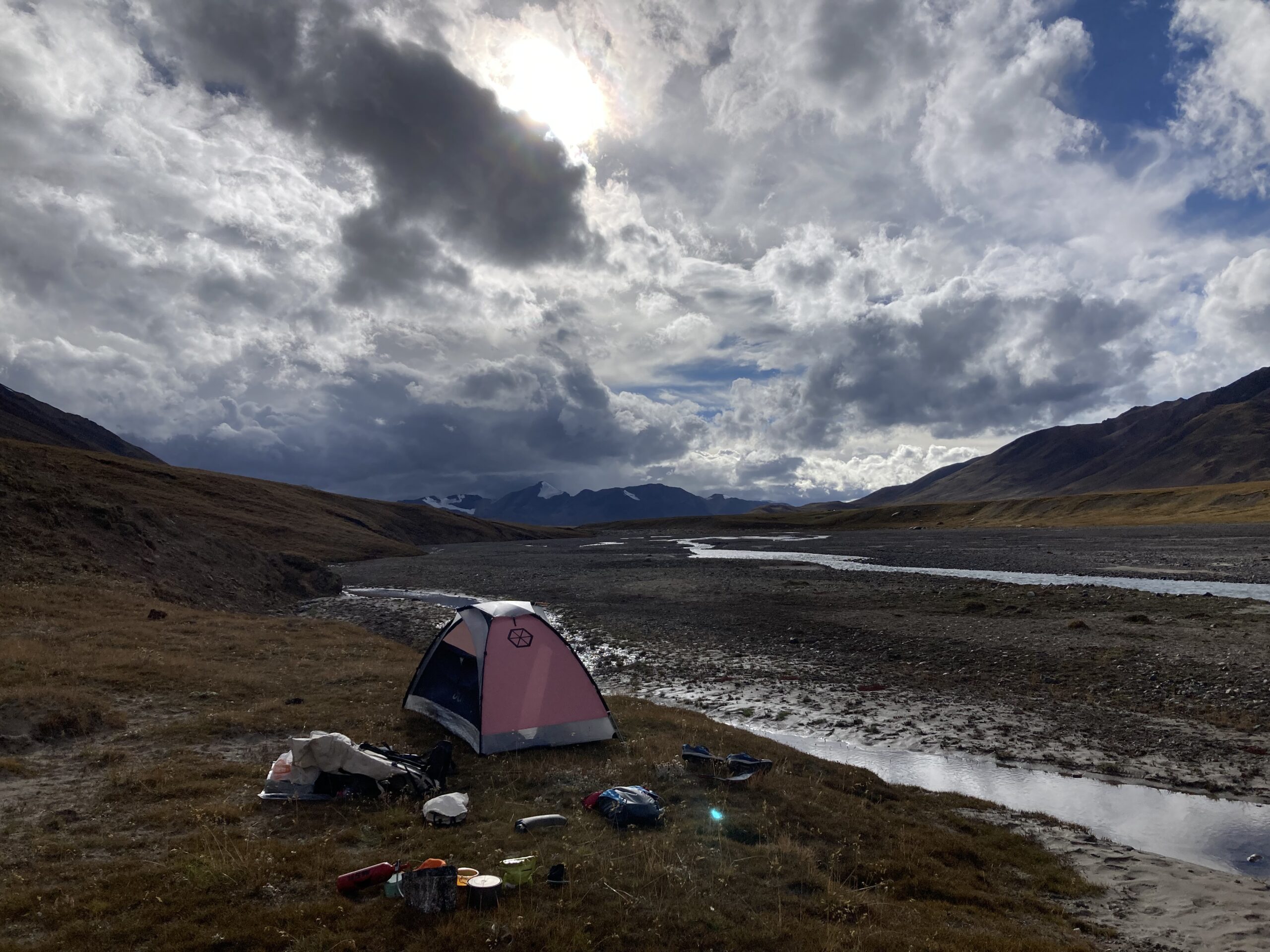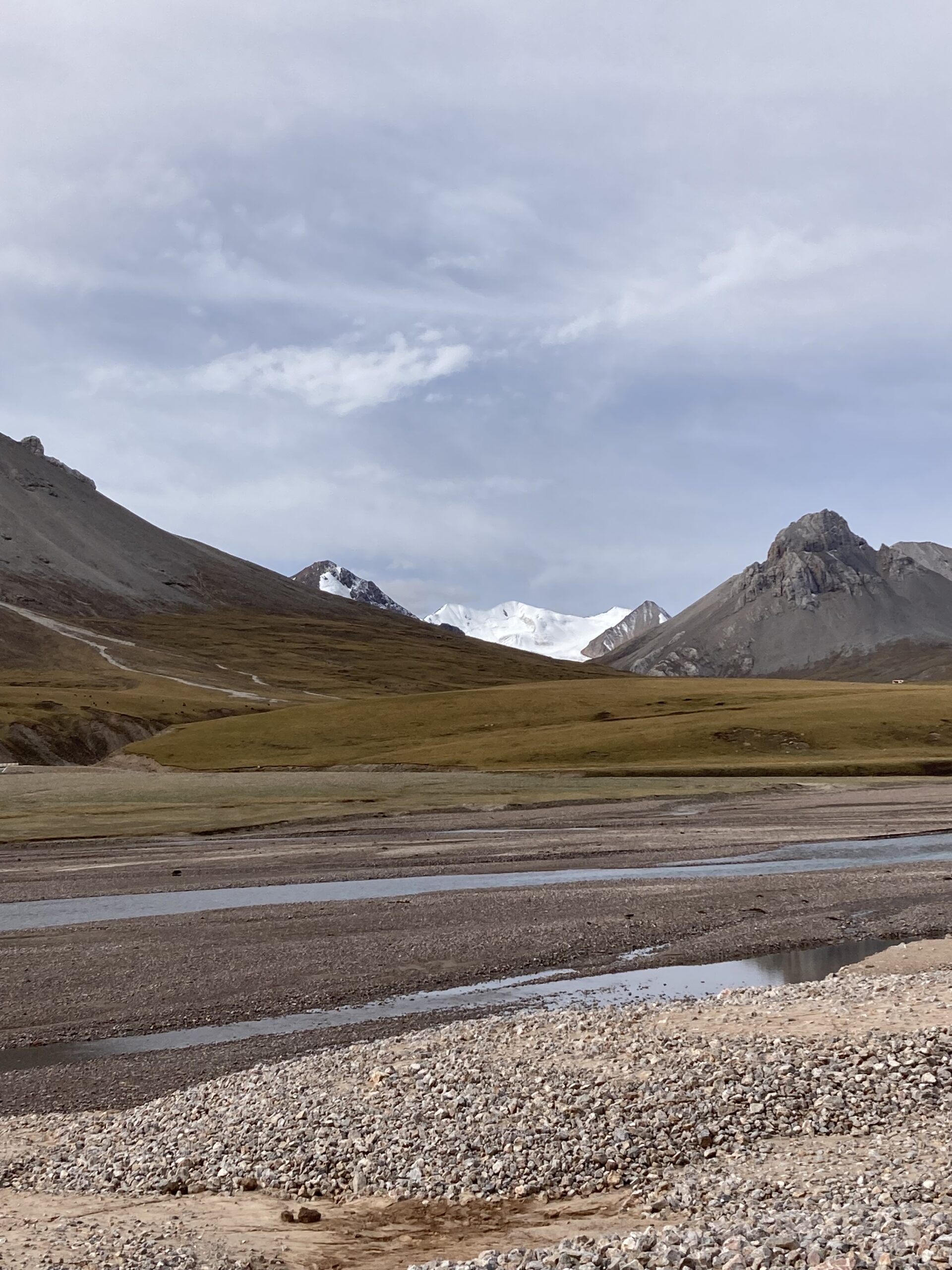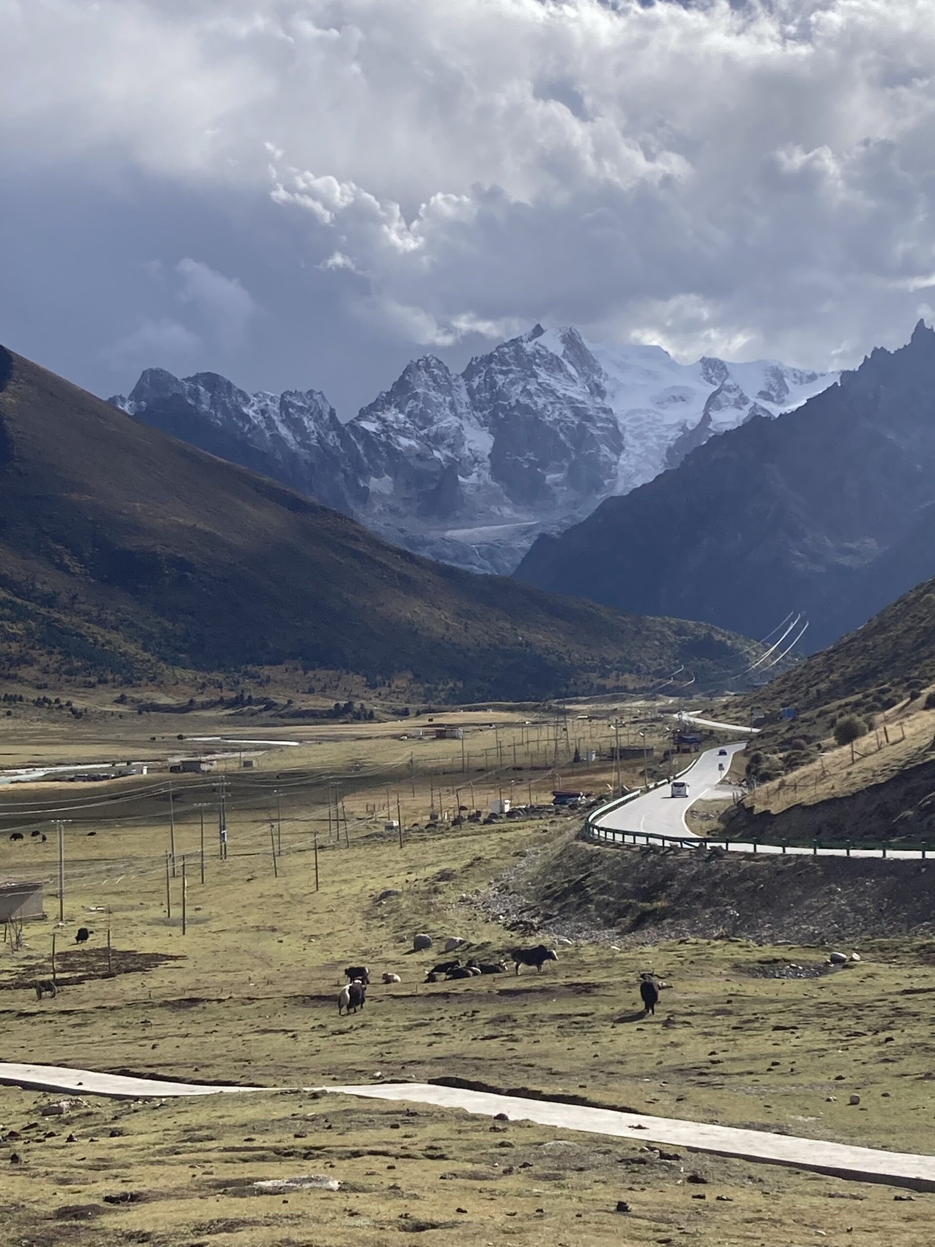 Der Verkehr auf der Straße, die zu einer Schotterpiste wurde, hielt sich arg in Grenzen. Ich wurde von Einheimischen mitgenommen, und dann von einem Touristen aus Lanzhou, der wie erstaunlich viele Chinesen der Mittelschicht wohl das erste Mal in der mehrtausendjährigen Geschichte ihres Landes die Möglichkeit, Zeit und Mittel hatten, ihr Land individualtouristisch zu bereisen. Selbstverständlich geschah dies oft in hochmodernen, oftmals allradgetriebenen Elektroautos oder Wohnmobilen. Der Tag war mittlerweile etwas fortgeschritten und mein Fahrer wollte von der Hauptstraße vor meinem geplanten Startpunkt abbiegen und einen Übernachtungsplatz suchen. Kurzentschlossen fuhr ich noch ein Stückchen mit ihm mit, ließ mich an einem Flusslauf hinauswerfen, und er fuhr noch etwas weiter. Ich schlug mein Zelt unweit des Ufers auf, kochte und genoss neben der Ruhe die Landschaft. Am nächsten Morgen, just als ich zusammengepackt hatte und im Begriff war, mich wieder auf die Hauptstraße zu begeben, hupte mein Fahrer vom Vortag, lud mich ein und brachte mich bis zu meinem Startpunkt, einer Brücke unweit eines Passes. Ich wählte das rechte Flussufer und begann meine Wanderung an diesem entlang. Die Szenerie wurde malerischer, vereiste Gipfel, Bäche zum Durchwaten, Yaks und ein paar Hütten oder Zelte der Hirten, das Wetter war durchwachsen mit Sonne, Regen, Wind und dem einen oder anderen Hagelschauer. Die dünne Luft machte mir doch etwas zu schaffen, so dass ich nicht allzu weit ging, sondern weit vor dem Abend mein Lager aufschlug. Am Folgetag lief ich weiter bergan, bis ich zu einem mäandernden Quellgebiet kam, wo der hier noch ziemlich un-mächtige Mekong seinen Ursprung hat. Dort verbrachte ich eine weitere Nacht und trat am Folgetag dann den Rückweg zur Straße an.