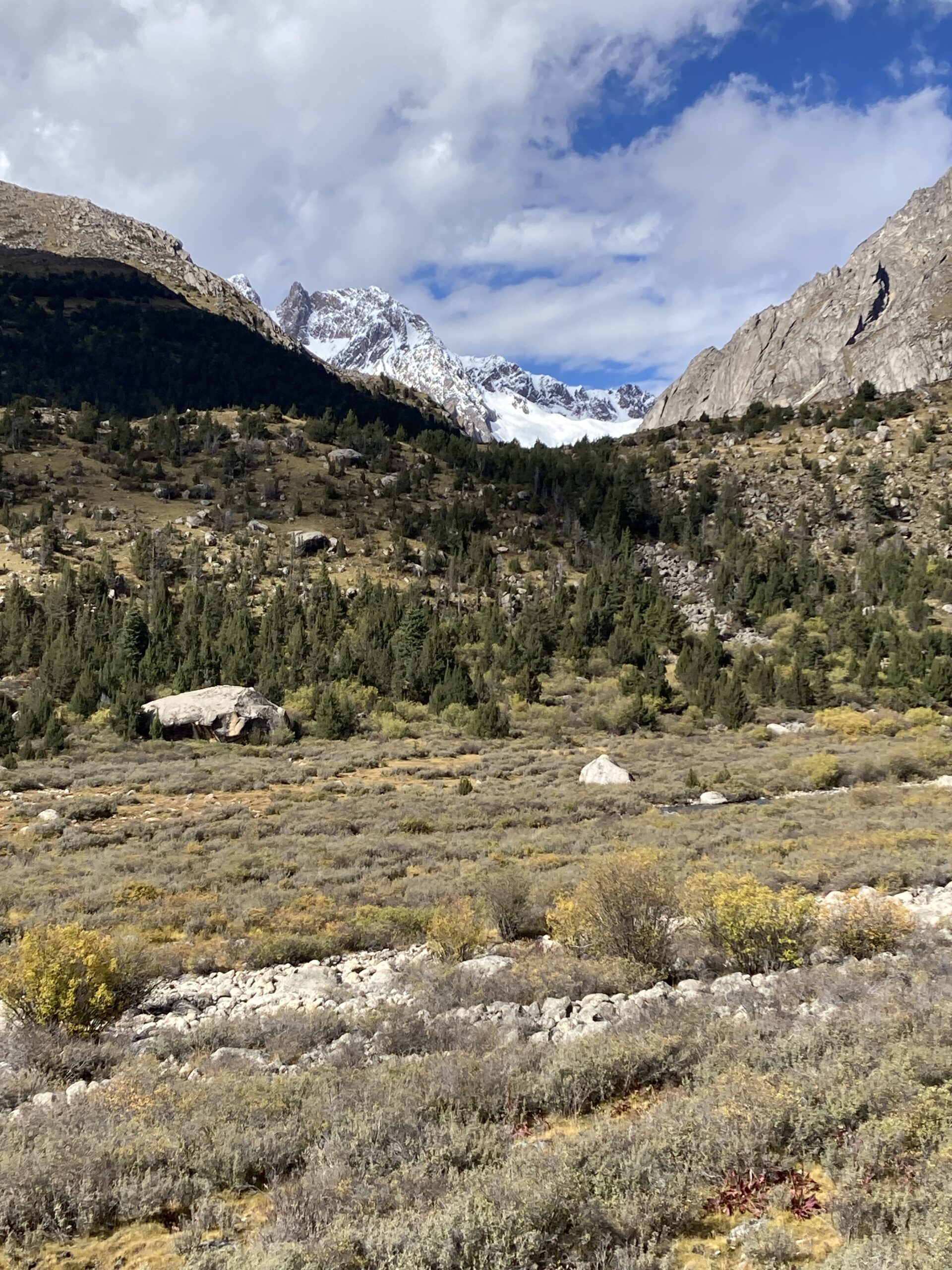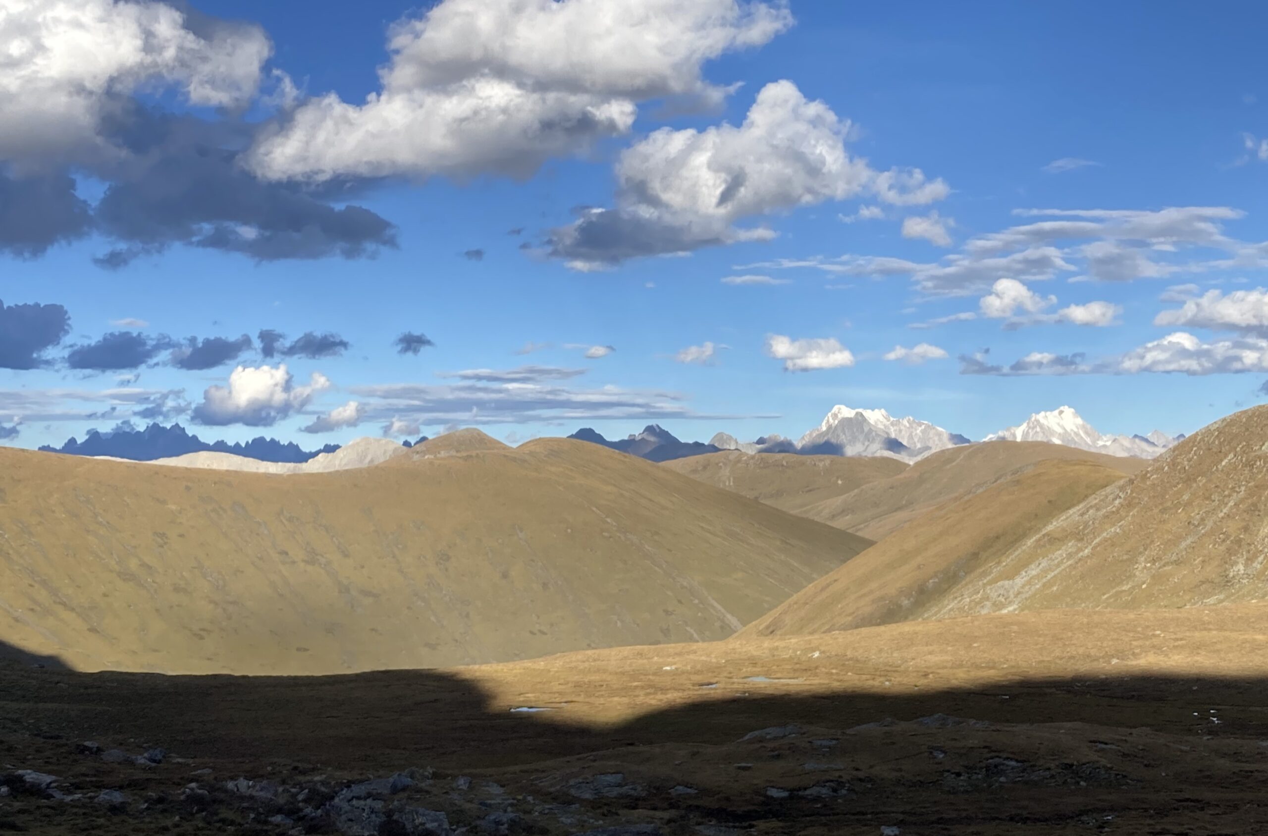 Also trottete ich zurück ins Tal, wurde wiederum ziemlich zügig mitgenommen und nahm wiederum einen weiteren Alternativplan in Angriff: eine Runde in einem Gebirgszug östlich bzw. parallel gegenüber des Konka-Massivs. Ich begann den Anstieg auf kleinen Straßen, passierte unbemerkt einen Kontrollpunkt (für was auch immer) und ließ bald die letzten Häuser hinter mir, durchstreifte den Hochwald und erreichte schon bald den Grat, auf dem der Weg entlangführte. Dieser war meist ganz gut, nicht zuletzt wegen der Hochweiden, auszumachen, einzig in häufiger werdenden Wäldchen wurde es etwas unübersichtlich. Und gen Nachmittag wurde mir ein Problem bewusst: auf einem Grat ist es eher schwierig Wasser zu finden. Irgendwann passierte ich ein Lager von chinesischen Touristen mit einheimischen Guides und ein paar Zelten, ich fragte nach Wasser und bekam eine Plastikflasche, ich dankte, fragte nach einer Quelle und es wurde mit dem Kopf geschüttelt. Da ich vom Umkehren genug hatte blieb nur der Weg weiter. Ich hoffte, dass dieser weiter gut sichtbar blieb und lief bald in die Dunkelheit hinein. Hilfreich war ein beinahe voller Mond, aber irgendwann, ein paar Kilometer vom Pass entfernt, hinter dem mit an Sicherheit grenzender Wahrscheinlichkeit fließendes Wasser existieren sollte, wurde es weglos. Und nicht nur weglos, sondern es gab faktisch nur noch Geröll bzw. Boulderfelder. Unschön, aber nun gab es kein Zurück mehr: Ich kraxelte, fluchte, rastete, schaute hier und da mal im Stirnlampenschein nach leichteren Passagemöglichkeiten, die letzten Wassertropfen wurden irgendwann auch getrunken, und deutlich später als projektiert, nämlich deutlich nach Mitternacht erreichte ich final den anvisierten Wasserlauf. Ich löschte den Durst, baute das Zelt auf, aß etwas und konnte nun erst den Blick auf den vom Mond beleuchteten Minya-Konka auf der anderen Talseite wirklich genießen.
