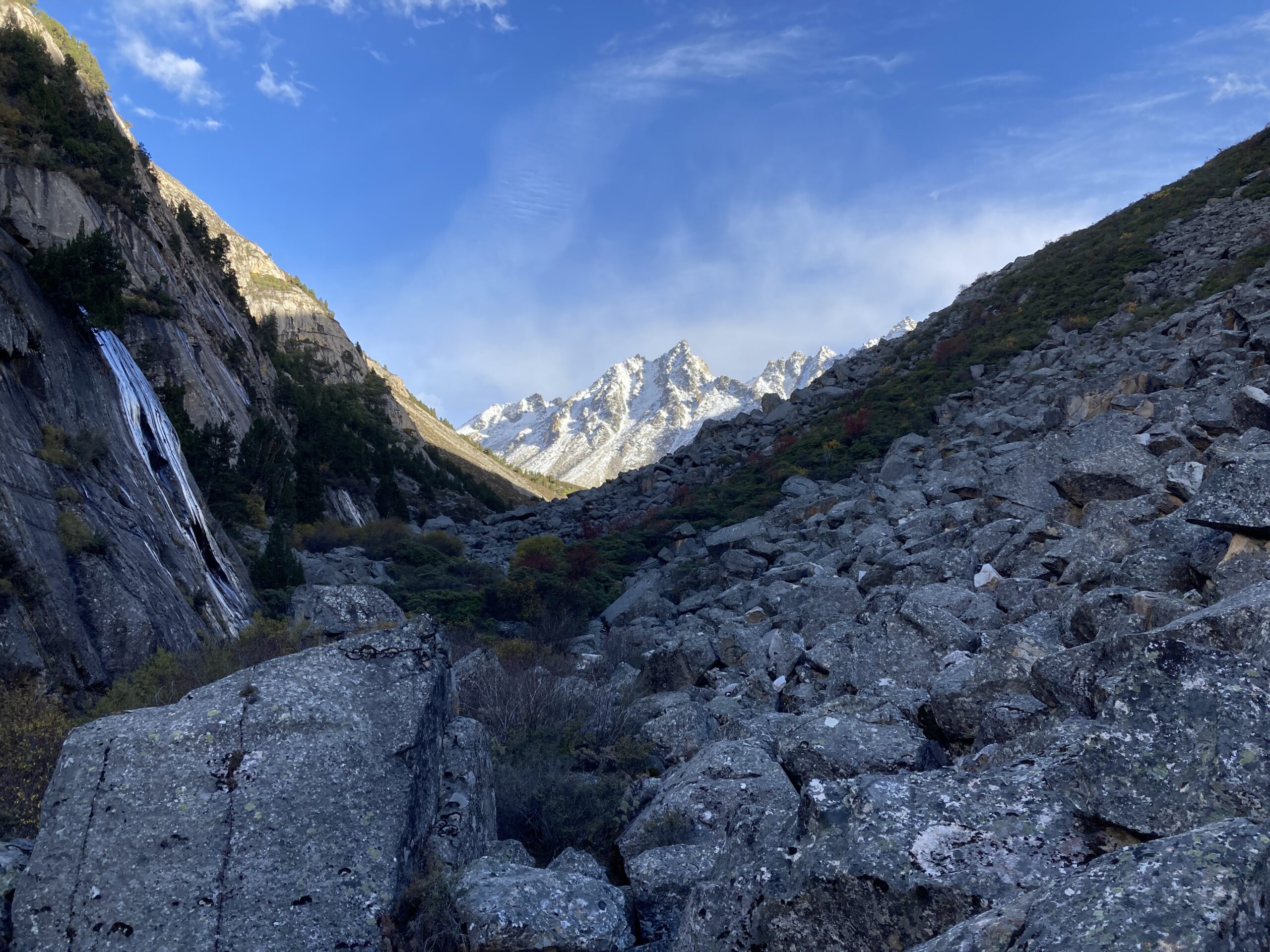 Am nächsten Tag war ich auf der G318, DER touristischen Straße Nummer 1 in China die von Shanghai bis Lhasa bzw. weiter bis zur Grenze zu Nepal führt. Davon zeugten neben zahlreichen SUV-Konvois und abenteuerlich anmutenden Wohnmobil-Selbstbauten auch erstaunlich viele Radtouristen. Ich ließ mich kurz hinter einem Pass rauswerfen und startete die nächste Tour nach Norden. Über Hochweiden, an Bächen und halbnomadischen Siedlungen vorbei gewann ich an Höhe, das Gelände wurde zunehmend unwegsam und kurz vor Dunkelheit baute ich mein Zelt auf nur relativ ebenem Boden auf. Am nächsten Tag überquerte ich einen Pass von über 5000 Metern, umgeben von einem Panorama naher hoher Berge, und in der Ferne sichtbarer höherer Gebirgsketten. Der Abstieg nach Nordwesten wurde schnell sehr fordernd: gigantische Blockfelder bzw. die Ergebnisse von Felsstürzen, mutmaßlich beim letzten Erdbeben passiert, machten die Fortbewegung anstrengend. Ich kreuzte, wechselte die Bachseiten, gewann und verlor an Höhe, und langsam kam ich voran. In diesem nicht nur unwegsamen sondern geradezu zerstörtem Gelände war an einen flachen Flecken zu Zelten nicht zu denken, so ging ich bis weit in die Dämmerung hinein und fand schließlich, nachdem zunehmend kleine Wäldchen dem Geröll Platz gemacht hatten, einen akzeptablen Flecken. Bald erreichte ich am nächsten Tag die Straße, mit mehreren Autos befand ich mich nicht nur bald wieder auf der G318, sondern auch wieder in Litang. Weiter ging’s am Folgetag nach Kangding mit Hilfe eines älteren höherrangigen Mitglieds der PLAAF, der permanent auf die Landstreitkräfte schimpfte, ziemlich riskant auf der nicht gerade risikoarmen Bergstraße fuhr und wir noch einem vom Weg abgekommenen anderen Fahrzeug halfen und dabei nebenbei auch Zeugen einer Himmelsbestattung wurden. Danach lud mich eine junge Polizistin in zivil in ihr Auto, sie telefonierte abwechselnd auf mandarin und tibetisch, und ihre sportlich-elegante Erscheinung fand eine Entsprechung in ihrem Fahrstil, der aber im Gegensatz zum Militär davor ziemlich sicher war.