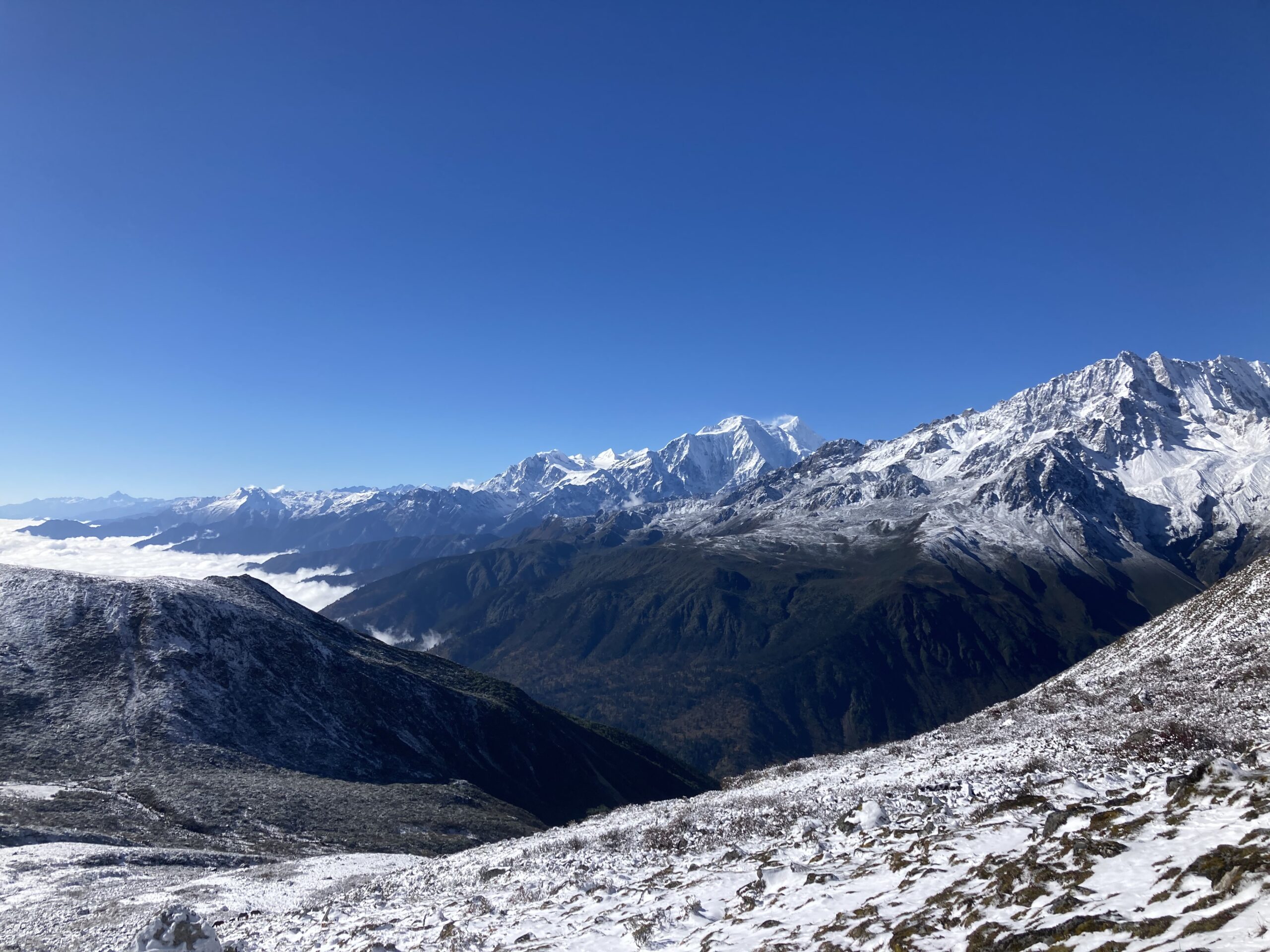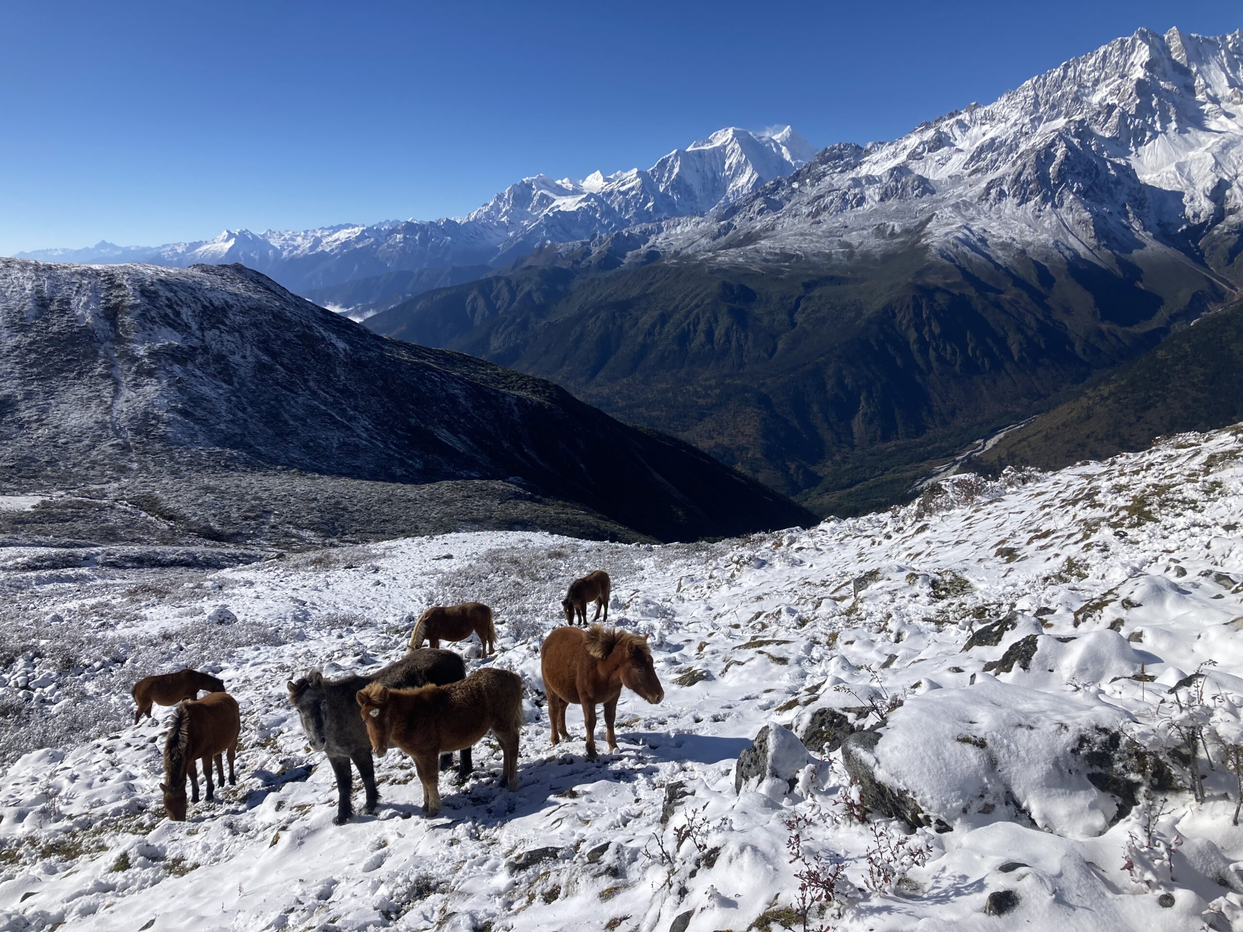 Der nächste Morgen zeigte sich im strahlenden Sonnenschein und ich kam erst ziemlich spät los, aber dann ganz gut voran. Das Wetter wurde allerdings immer schlechter, es nieselte und die Sicht wurde mehr und mehr durch aufsteigenden Nebel behindert. Vor einer Passhöhe zeltete ich an einem Bach. Das Wetter blieb nachts regnerisch, und auch am nächsten Tag blieb es nicht nur nasskalt, sondern auch die Sicht blieb schlecht. Abends bei einsetzendem Schneefall und Sturm erreichte ich dann einen Punkt, von welchem nur noch ein Pass zu queren, und von dort aus der Weg ins Tal frei war. Nachdem ich nachts eingeschneit wurde schien aber am nächsten Morgen mal wieder die Sonne und der Blick auf die gegenüberliegende Minya-Konka-Kette öffnete sich. Die Laune stieg und ich legte den Weg hinauf ganz zügig zurück, puschelige freilaufende Pferde zeigten sich neugierig, und im sehr langen Abstieg drosselte ich mein Tempo. Auf den letzten Metern begegnete ich staunenden Leuten, und auf der Straße wurde ich prompt von Polizisten mitgenommen, die angesichts meines Alters anboten, mich mit näheren oder ferneren Bekannten oder Verwandten zu verheiraten. In Kangding kehrte ich wiederum das dritte Mal in „meinem“ Hotel ein, erstand ein Busticket für den nächsten Tag nach Chengdu und erkundete das Städtchen ein weiteres Mal.