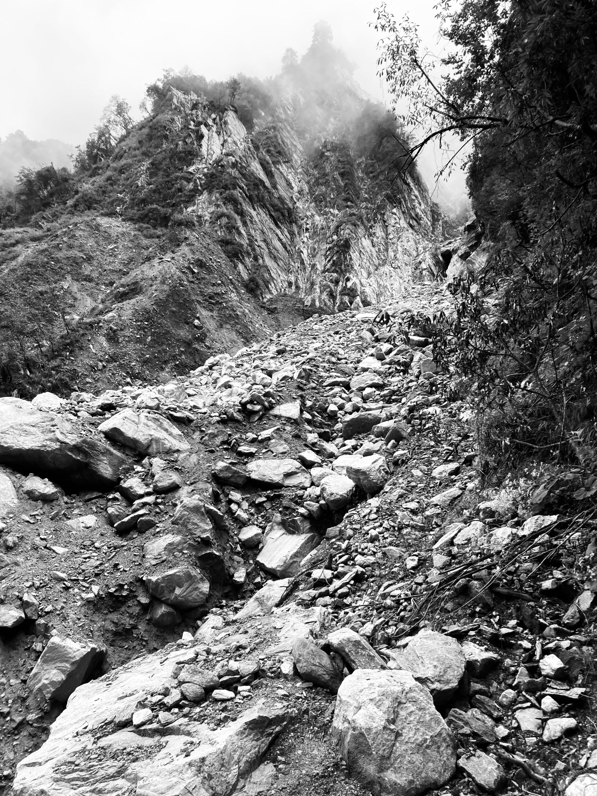 Also, Plan B, irgendwie um das Massiv herum kommen um es dann von Süden zu queren: Ich wählte die östliche Route, da mir die westliche bereits bekannt war. Trampend kam ich ganz gut voran, bis mir von Radfahrern an einer Kreuzung mitgeteilt wurde, dass ein Tunnel der von mir gewählten Straße seit dem letzten Erdbeben verschüttet sei. Was tun? Noch einmal zurück nach Kangding und den Weg in die andere Richtung versuchen? Ausgeschlossen, ich hatte schon den gestrigen Tag verloren. Stattdessen gedachte ich, es mit einem Stich ins Minya-Konka-Massiv zu versuchen, schaute mir auf der Karte eine mutmaßlich günstige Stelle aus und begab mich zum Startpunkt des Weges bzw. dem Ende der Straße. Bauarbeiter machten mir sehr deutlich, dass der gewählte Weg wegen Erdrutschen nicht passierbar sei. Ich dachte, dass es so schlimm nicht sein kann und ging weiter. Nach dem Passieren der Baustelle war der Weg immer öfter von massiven Erdrutschen zerstört, die zuerst noch relativ einfach zu queren waren, aber immer schwieriger im ziemlich steilen Gelände wurden. Das, was vom einstigen Weg noch übrig war, war zugewuchert. Es dämmerte, und die Zeltplatzsuche in diesem Gelände war schwierig. Irgendwann fand ich einen Flecken, am tosenden Bachlauf, genau unterhalb eines solchen Geröllsturzes. Am nächsten Tag trat ich den Rückweg an, da nach einigem Herumkundschaften der weitere Weg unmöglich zu finden gewesen war.
