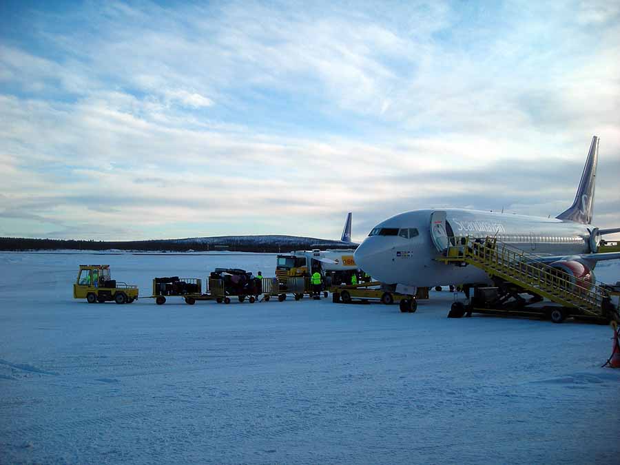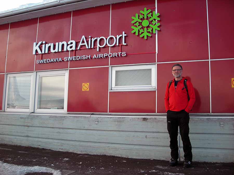 Gespannt verfolge ich aus dem Fenster des Fliegers die Route nach Norden entlang der Ostsee, die allmählich zufriert. Vor der Landung einsame weite Winterlandschaft. Wir sind offenbar richtig. Der Flughafen Kiruna hat den Charakter eines Busbahnhofes. Ein bestellter Taxifahrer hält ein Schild mit meinem Namen. Wir fahren zunächst in die nüchterne Bergbaustadt, um Brennstoff für Kocher und Laterne zu kaufen. Dann geht´s in rasanter Fahrt spikesbereift auf eisig schneewehender Piste knapp 70 km nach Westen, bis in Nikkaluokta die Straße endet. Ein teures Vergnügen. Gut, dass der Chef dabei ist.