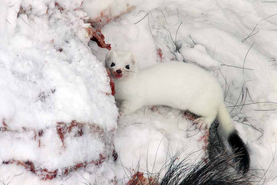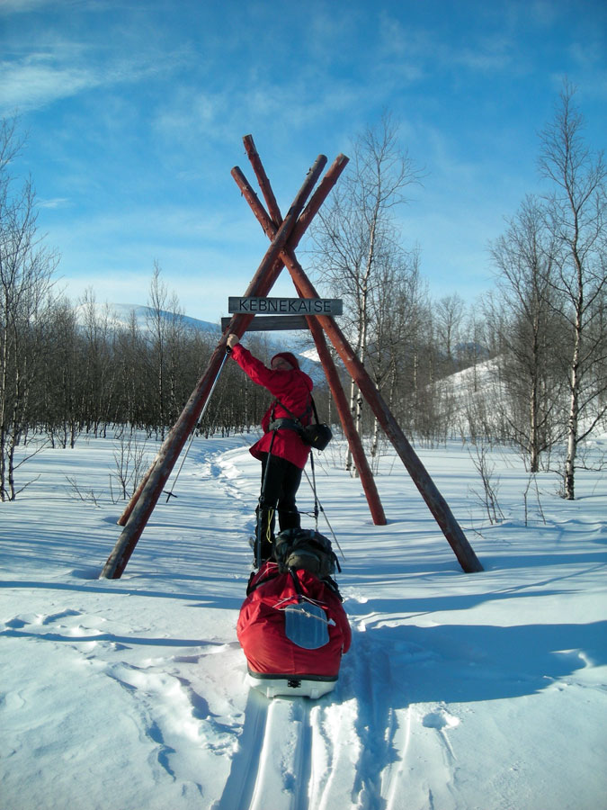 Etwa eine Tagesetappe vor Abisko haben wir den Kungsleden verlassen. Wir folgen den vereinzelt blassroten Kreuzen als Wegmarkierung nach Osten. Hier sind offenbar selten Menschen unterwegs. Aber es gibt viele Tierspuren. Ein fliehender Vielfraß verrät seinen Kühlschrank. Im Schnee hat er sein erlegtes Ren vergraben. Ein weißes Hermelin als Mitesser leckt dort auch sein blutiges Schnäuzchen. Später eine Elchfamilie, Spuren vom Luchs und über allem der segelnde Seeadler. Die nordische Wildnis jenseits ausgetretener Pfade.
