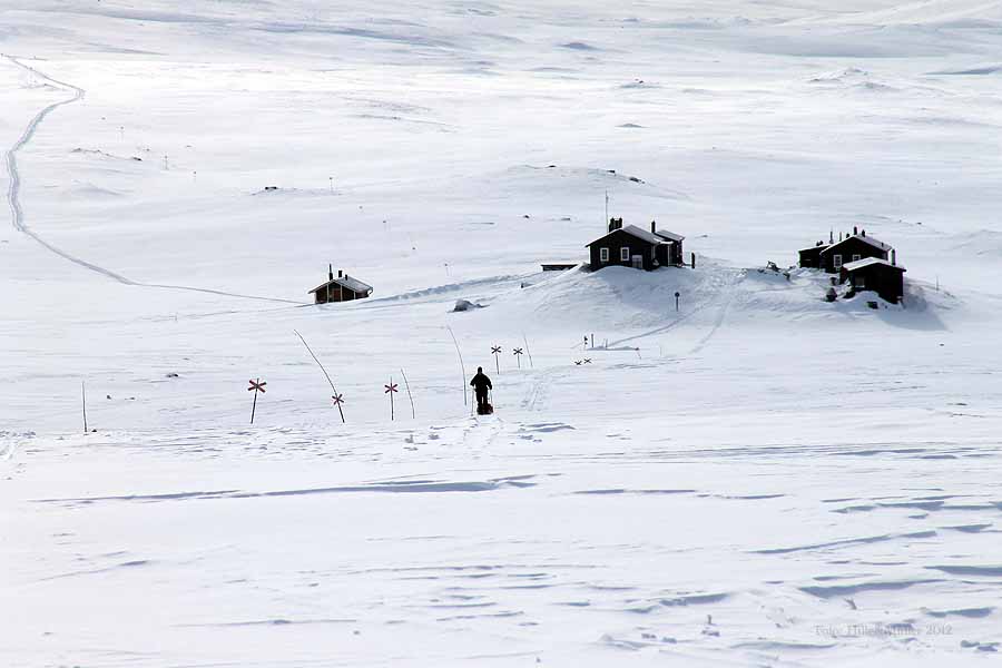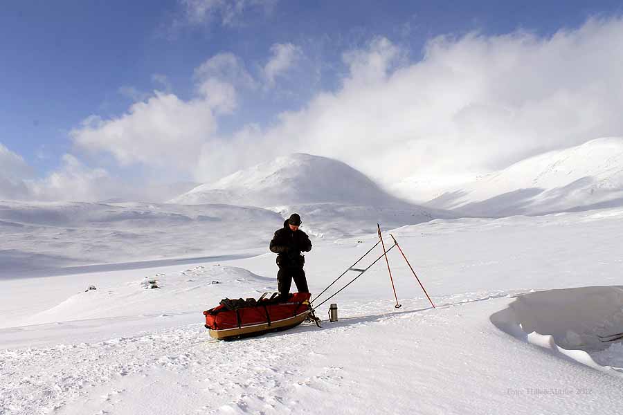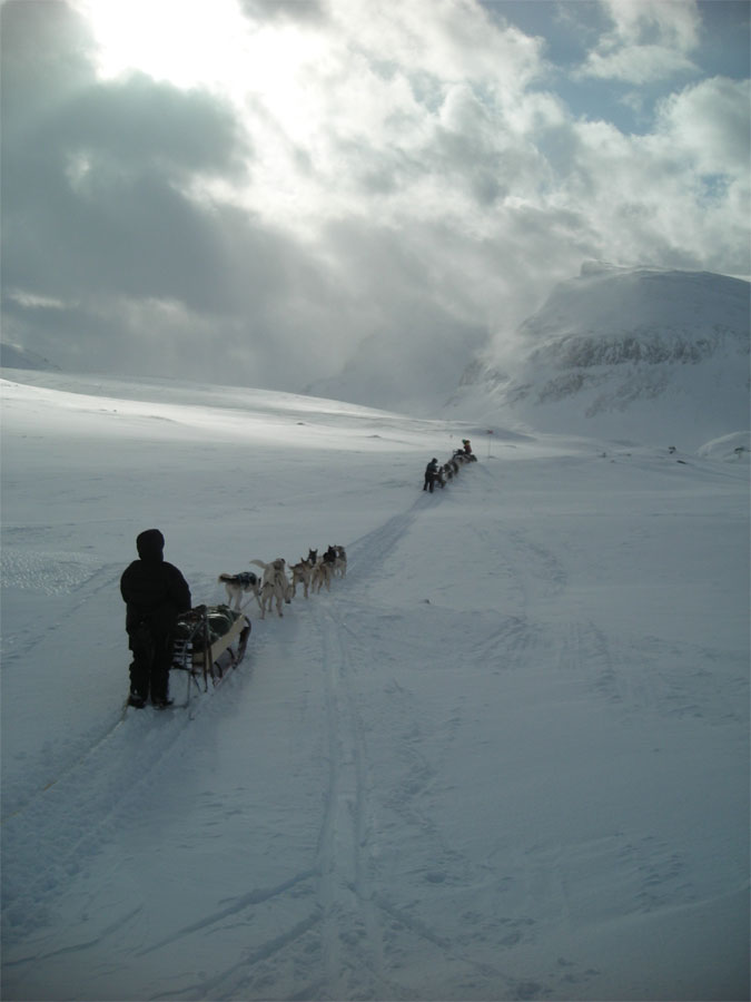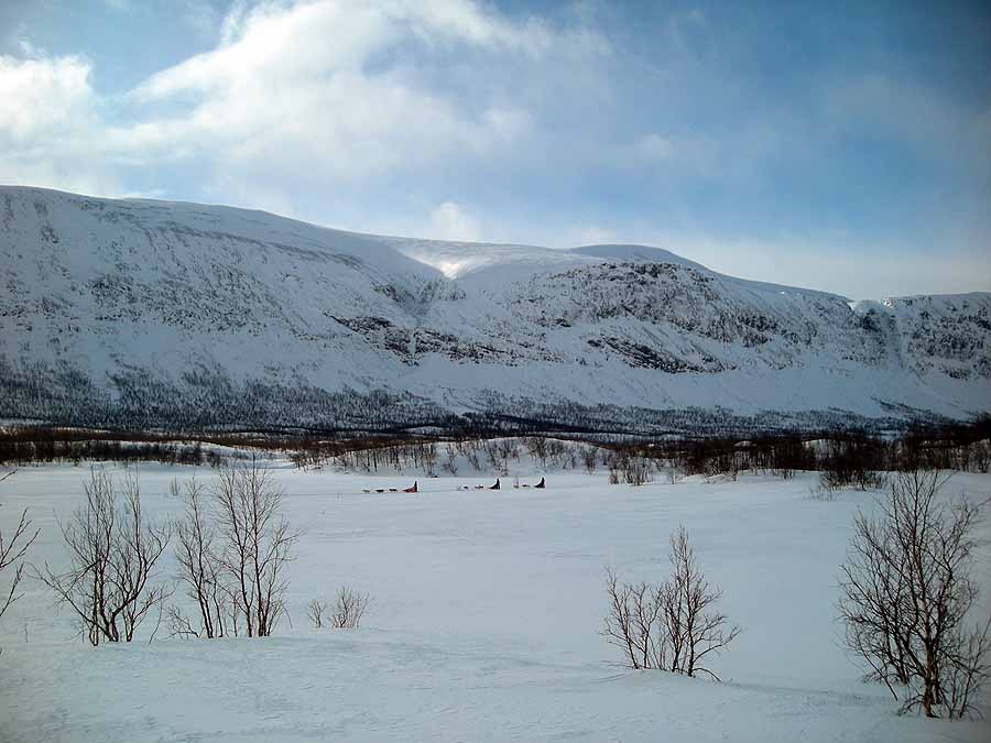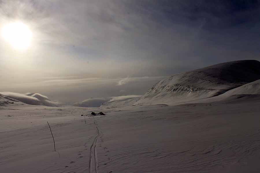 Die stürmische Nacht lässt die Hütte ächzen und beben und auch der nächste Morgen ermuntert nicht zum Weiterlaufen. Eigentlich sollte der Berg Sälka (1865m), zu dessen Füßen wir gerade klein beigeben, unser Berg werden. Eine Besteigung bei gutem Wetter soll eine grandiose Aussicht auf die große schwedische Gipfelkette mit Kebnekaise und nach Westen bis zum Atlantik bieten. Am Nachmittag unternehmen wir im Schneetreiben einen vorsichtigen Versuch, in seine Ausläufer einzusteigen, als uns eine donnernde Lawine zu unseren Füßen klarstellt: diesmal nicht. Bekehrt kehren wir um. Den zweiten Hüttenabend teilen wir uns mit der inzwischen per Motorschlitten eingeflogenen lüsternen Boulevardpresse aus Stockholm.