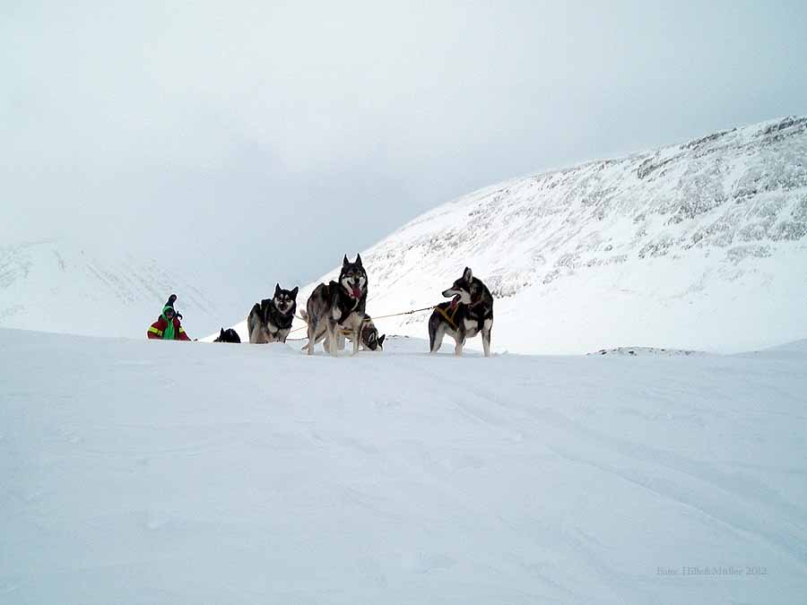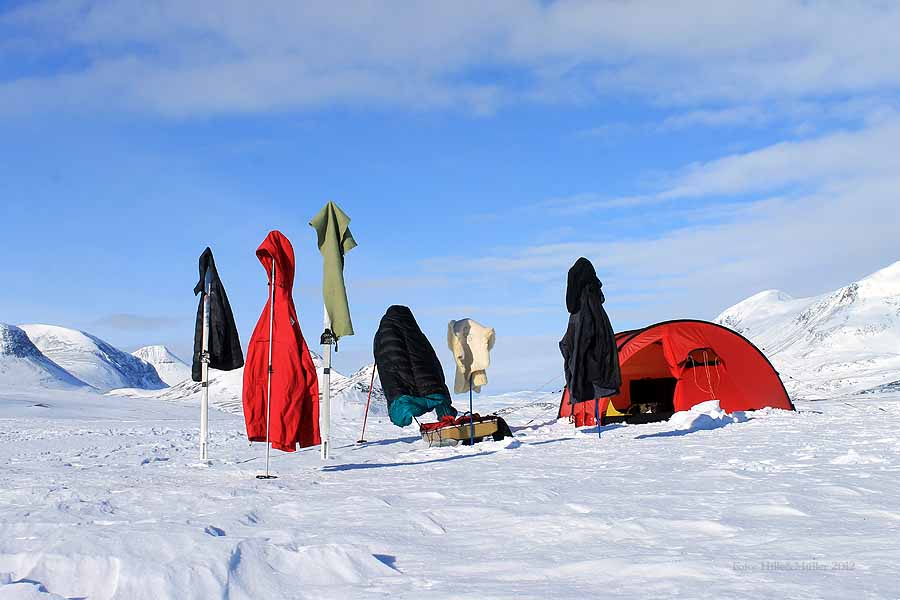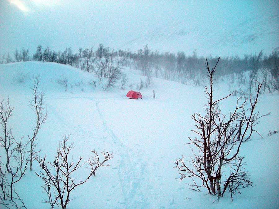 Der erste Morgen, welch ein Tag! Strahlendes Blau, Winterstille. Wir beginnen die Tour mit einigen lustigen Pirouetten im Schnee für ein schließlich misslungenes Selbstauslöser-Startfoto. Was soll´s, jetzt geht’s endlich los. Nach diesem Moment sehne ich mich immer ein ganzes Jahr lang. Wir laufen nach Westen durch ein weites Tal. Wie zu erwarten ist hier einiger Verkehr. Schließlich befinden wir uns auf dem Zubringer zur „A9 der Wintertourengeher“, dem nördlichen Kungsleden. Uns begegnen drei Hundegespanne, zwei Schneescooter und eine Gruppe Franzosen auf Skiern am ganzen Tag. Nach 6 km die erste Raststätte. Wir parken die Pulks vor „LapDånalds“. Leider werden die berühmten Renburger nur im Sommer angeboten und so reichen wir uns vor der winterschlafenden Kote mit leichter Überwindung Müsliriegel aus eigenem Proviant. Kurz vor der Kebnekaise-Fjällstation lässt uns ein plötzlich sichtverschlingendes Schneegestöber nicht lange zögern: Genug für heute. Wir finden zwischen schneeumfegten Hügeln und gebeugten Birken einen ebenen Platz zum Zelten. „Schaffst Du das allein?“ “Klar!“ rufe ich in den Wind, während sich der Chef mit der Kamera entfernt, um die tosende Stimmung einzufangen. Etwas nervös wühle ich kniend im Schnee, um die Heringe für unser sich wild gebärdendes 4-Mann-Expeditionszelt einzugraben, als es passierte: Wie ein aufgeschrecktes Schneehuhn, nur rot, flog plötzlich der Packsack des Zeltes davon. Uneinholbar, in Zeltleinen verstrickt konnte ich dem exotischen Vogel nur nachblicken, bis er im Grau des Schneetreibens verschwand. Wie peinlich, gelte ich doch als der Zeltfreak und bin berüchtigt ob meines peniblen Zeltaufbaus. Mit gesenktem Haupt beende ich mein Bauwerk als der schnelle Chef plötzlich auftaucht und – tatsächlich – da flattert doch etwas Rotes in seiner Hand.
