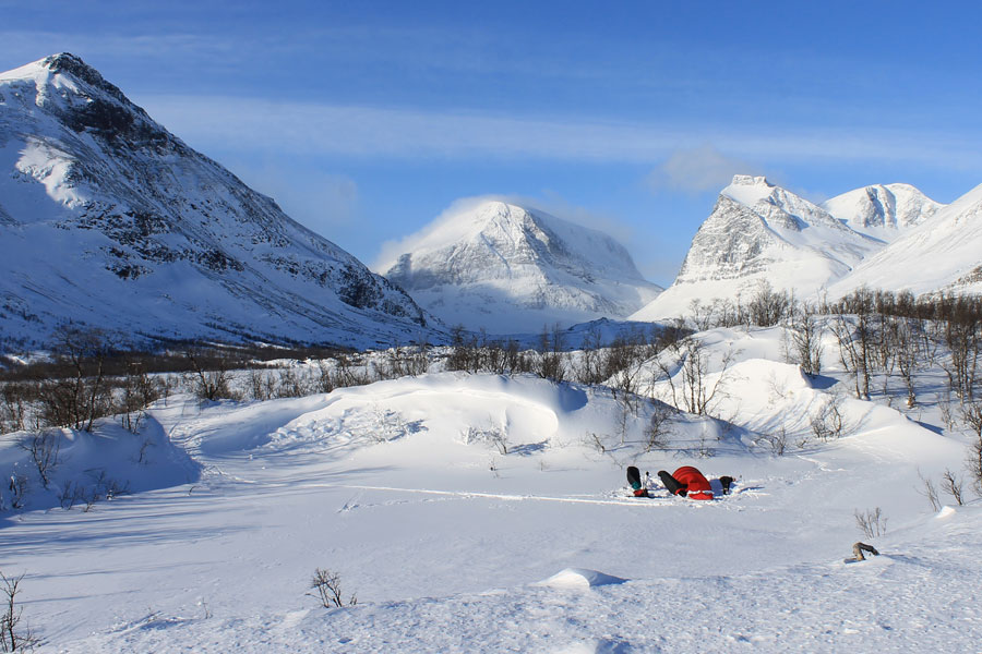 Nächster Tag, neues Glück! Sonne flutet durchs Zelt, Windstille, unglaublich. Das Kebnekaise-Massiv baut sich majestätisch vor uns auf und seine steilen Felswände weisen uns den Weg nach Südwesten. Anders als am Vortag geht es jetzt spürbar bergan. Ein Blick zurück in das aus dieser Perspektive fast lieblich erscheinende Tal, in dem sich unter der Schneedecke zwischen dünnem Birkenbestand windende Wasserläufe und Seen ahnen lassen. Vor uns eisige Mondlandschaft flankiert von abweisendem Fels. Es geht weiter aufwärts. Als wir endlich den Pass erreicht haben, bin ich in Angesicht des keuchenden Chefs froh, dass es jetzt nur noch bergab geht. Abends im Zelt reiche ich dem schüttelfrierend Angeschlagenen, Wärmflasche und Schnaps. Offenbar das beste Mittel gegen eingeschleppte Zivilisations- und Chefbüroviren, denn bald schon unterhalten wir uns angeregt über klassische Musik und unsere sehr unterschiedliche Sozialisation in den Nischen der DDR.