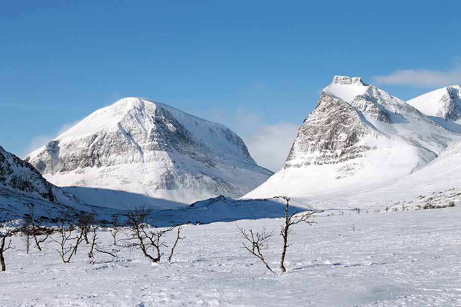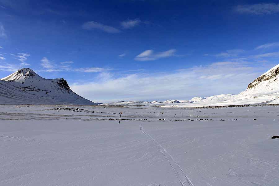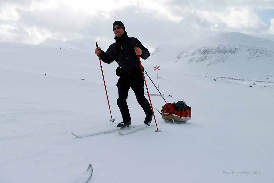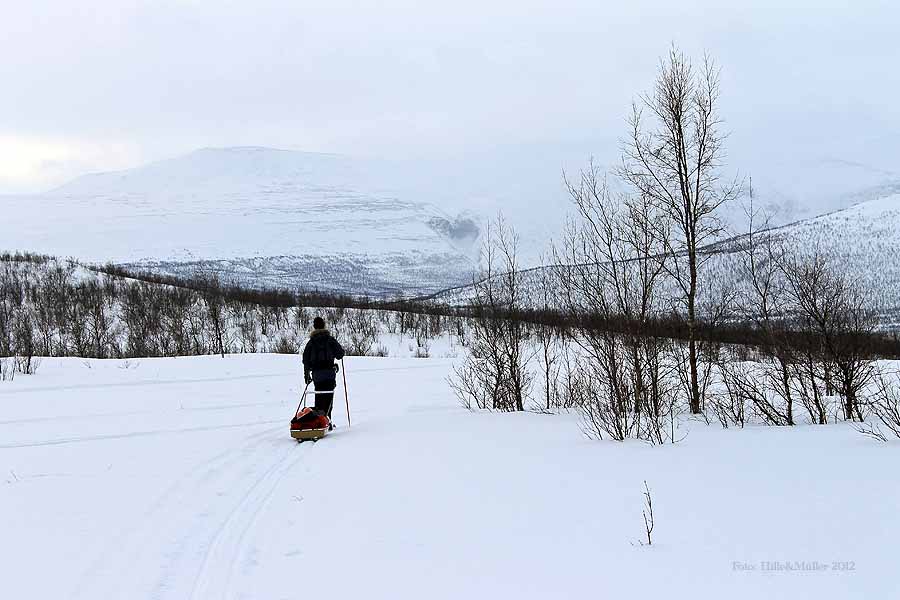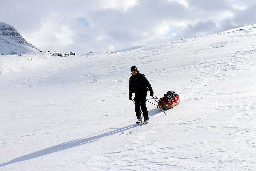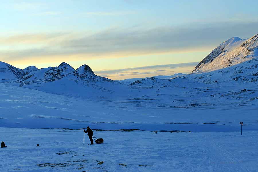 Dieser Tag steht ganz im Zeichen des Tjäktjapasses – dem Höhepunkt des Kungsleden – dessen Linie sich in der Ferne bereits abzeichnet. Wir streben dahin mit fließender Energie. Ein dahin tapsendes Schneeschuhpärchen beneidet uns, um unsere gleitende Fortbewegung auf Skiern. Später, als es steiler wird, gerät das Gleiten allerdings etwas ins Stocken. Euphorisiert durch immer grandiosere Rückblicke in das weite Trogtal, kämpfen sich zwei winzige Ameisen mit Gepäckschlitten immer weiter hinauf zum Badewannenrand. Unglaublich, was diese kleinen Tierchen so schaffen!