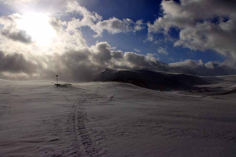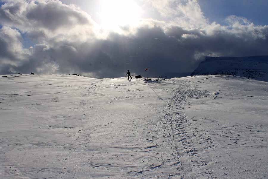 Ich liege noch im Schlafsack, als uns ein vorbeieilender Kungsleden-kommunikationsbedürftiger vor dem Wetterbericht warnt: Starkwind ab 14Uhr! „Naja, dann woll´n wir doch mal“, schäle ich mich aus den Daunen und plustere mich auf zum Kräftemessen. Tatsächlich beginnt es kurz nach zwei ordentlich zu wehen. Die Landschaft verwandelt sich in einen fliegenden Teppich mit Fransen, lichtgetränkt und schattiert in einem bizarren Muster aus Sonne und Wolken. Im Windschutz der Kuoperjokka- Schutzhütte genießen wir während der Mittagspause fasziniert dieses Schauspiel. Und wieder überlassen wir uns dem Rausch der Elemente auf einsamen Bahnen. Es fällt nicht schwer, denn der Wind weht uns inzwischen nach Norden, da wo wir hin wollen.