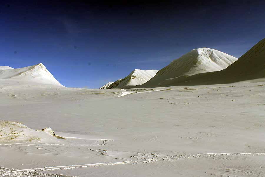Die letzten Etappen vergehen wieder mit nomadischer Routine, ohne dass wir versäumen, die sehr abwechslungsreiche Landschaft mit allen Sinnen aufzunehmen. Am letzten Pass allerdings versagen meine Sinne komplett. White out. Keine Kontouren, Himmel und weiße Landschaft werden eins. Geht es hoch oder runter? Nur die Skispitzen zeigen wo vorn ist. Plötzlich scheint es immer steiler bergab zu gehen – verkrampft in Schneepflugstellung stemme ich mich gegen das Nichts – aber es wird immer schneller – gleich falle ich…! Da muss ich feststellen, ich stehe ja auf der Stelle.
