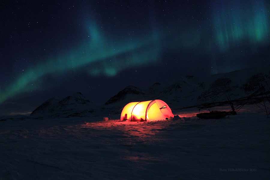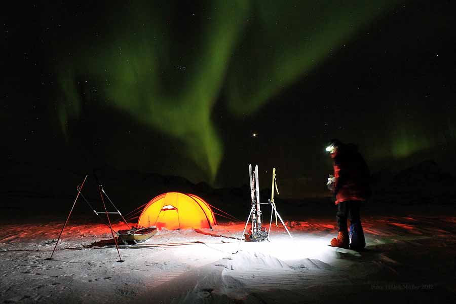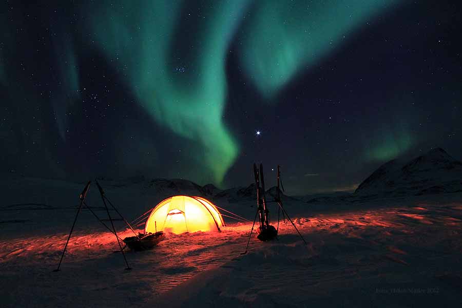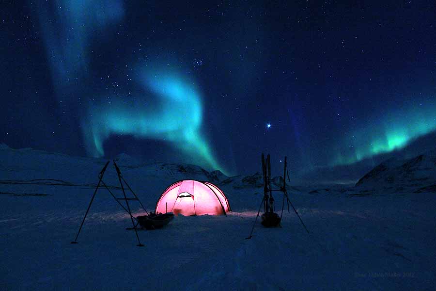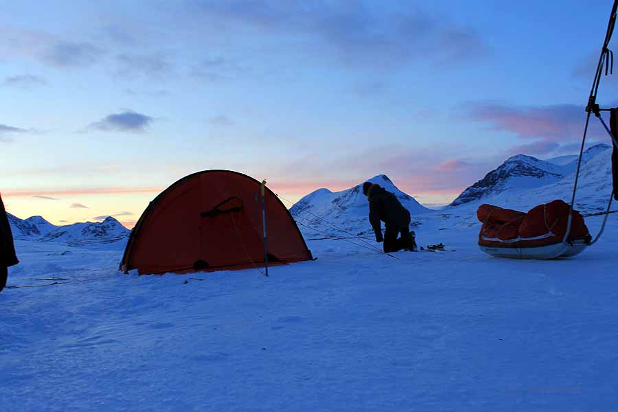Wir erkämpfen uns einen weiteren Höhepunkt. In exponierter Lage stellen wir unser rotes Zelt vor grandioser Bergkulisse in das zarte Lila des klaren Winterabends. Wir wollen gar nicht reingehen, als die ersten Sterne zu funkeln beginnen. Aber gleich ist Küchenschluss und ich unterbreche die Stille mit dem Fauchen des Kochers. Diesmal gibt’s kein Dessert, aber dafür Lichtshow kostenlos. Man kann das Polarlicht kaum mit Worten beschreiben. Bei den Sami galt es als Aktivität der Geister von Verstorbenen und mir kommt es tatsächlich so vor, als seien die wehenden Himmelsgardinen ein Medium in eine andere Dimension. Schade nur, dass die Füße irgendwann kalt werden und auch der Kopf droht vom Hin- und Her-Staunen bald aus seinem Gelenk zu fallen.