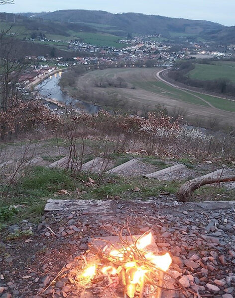Am letzten Tag ging es dann noch mal 450m hoch und 550m runter, bis wir uns nach ca. 13km wieder einen Schlafplatz in der Nähe unseres Ausgangspunktes suchten. Die Wahl fiel auf einen sonnigen Platz in der Nähe von kleinen „Ferienhäusern“, wo wir den Tag und die Wanderung bei einem Lagerfeuer mit Blick auf Hohewarte ausklingen ließen.