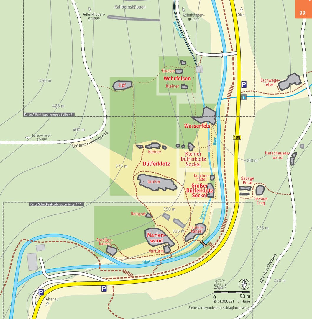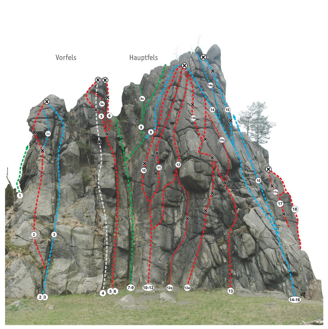 Der Führer enthält detailreiche Topos, Wandfotos, Anstiegsskizzen und Routeninfos. Alle relevanten Zustiege, Schwierigkeiten und Hinweise zur Absicherung sind klar strukturiert dargestellt – ideal für eine sichere und effiziente Tourenplanung im abwechslungsreichen Sandsteingebiet.