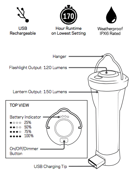 Dimmbares Dual LED Licht mit toll bedienbarem Drehregler bis zu 210 Lumen spendet die Lighthouse Mini Lantern. Die vierstellige Kapazitätsanzeige, der wechselbare 18650 Lithium-Akku und die universelle USB-Ladefunktion macht die kleine und leichte Zeltlaterne besonders praktisch - ob per USB aufladen oder mit einem Solarpanel.