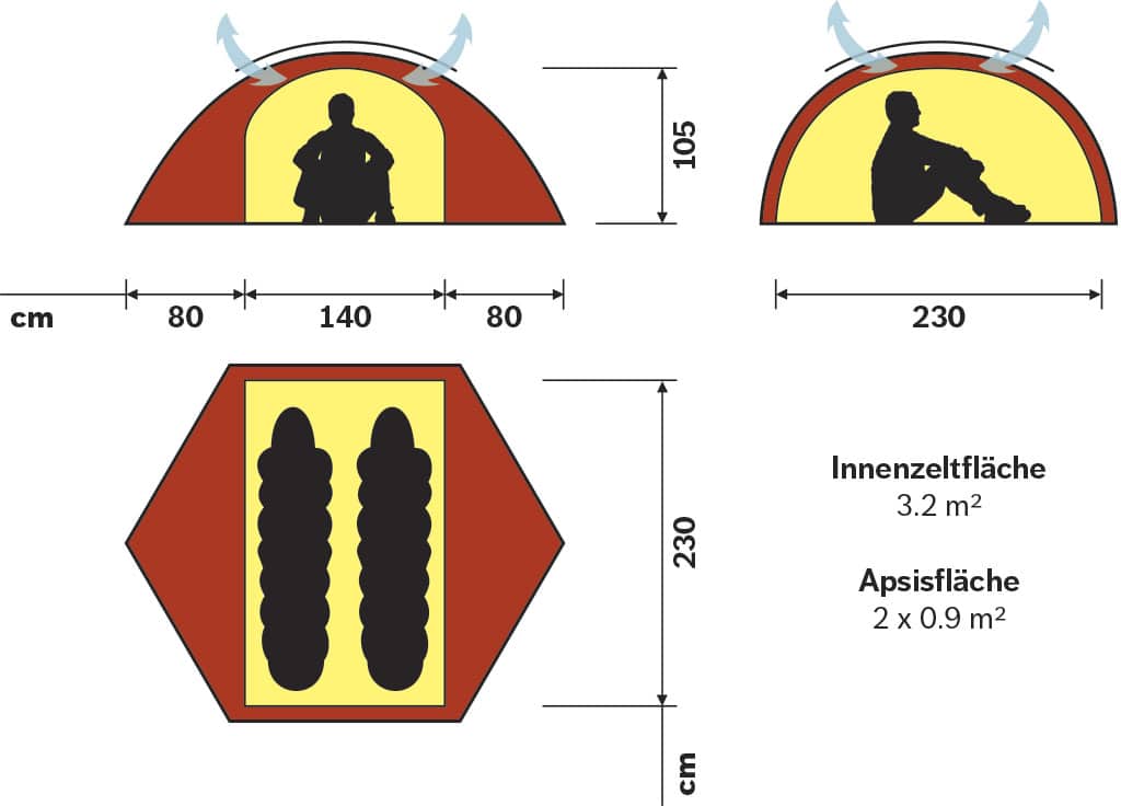 Personen : 2 Eingänge : 2 Apsiden : 2 Maße Innenzelt : LxBxH 230x140x110cm... mehr