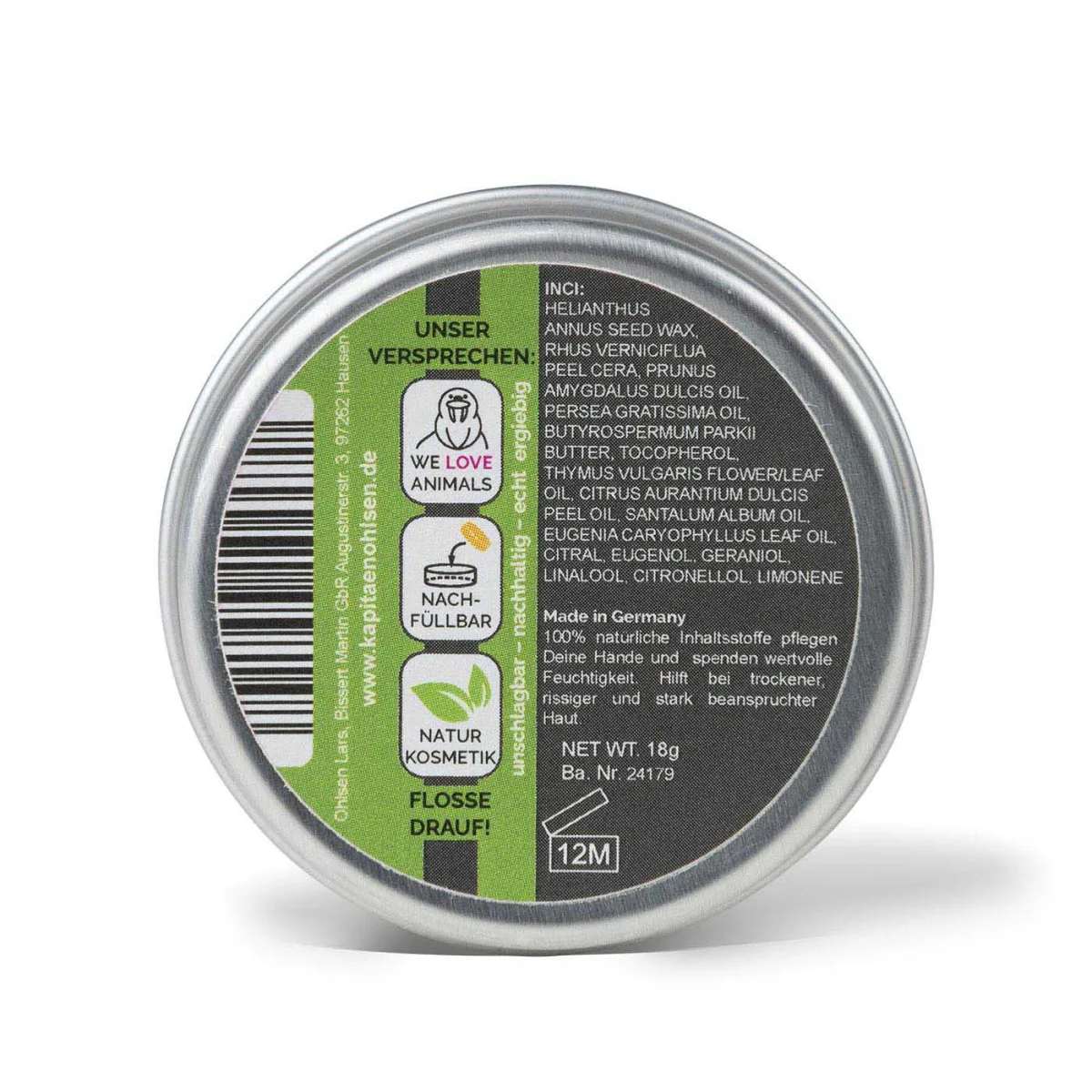 HELIANTHUS ANNUS SEED WAX (Sonnenblumenwachs), RHUS VERNICIFLUA PEEL CERA (Beerenwachs), PRUNUS AMYGDALUS DULCIS OIL (Mandelöl), PERSEA GRATISSIMA OIL (Avocadoöl), BUTYROSPERMUM PARKII BUTTER (Sheabutter), TOCOPHEROL (pflanzliches Vitamin E), THYMUS VULGARIS FLOWER/LEAF OIL (Eisenkrautöl), CITRUS AURANTIUM DULCIS PEEL OIL (Orangenöl), SANTALU ALBUM OIL (Sandelholzöl), EUGENIA CARYOPHYLLUS LEAF OIL (Nelkenöl)
