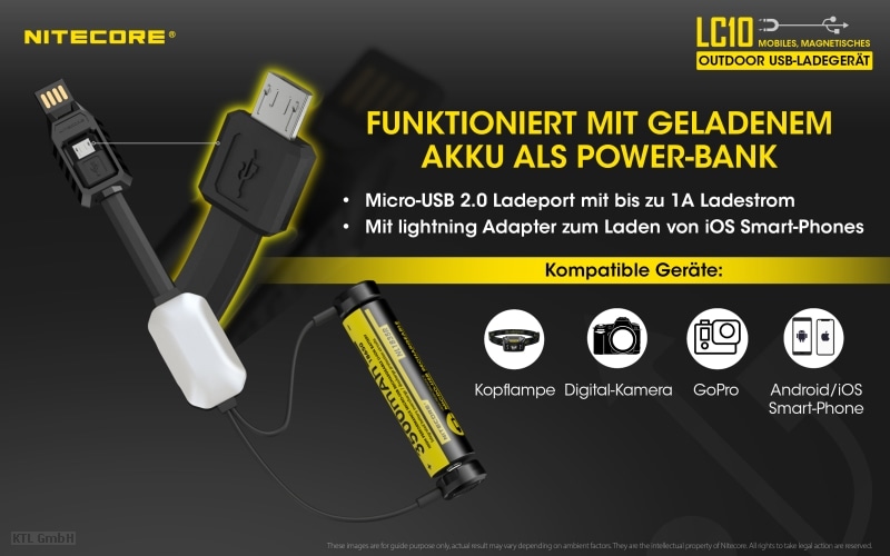 Das LC10 Ladegerät von Nitecore ist in seiner Kompaktheit kaum zu übertreffen. Es kann eine Vielzahl von Li-Ion Akkus laden, diese anschließend aber auch als Powerbank nutzen und wiegt dabei nur ca. 28 g. Ein idealer Begleiter für unterwegs.