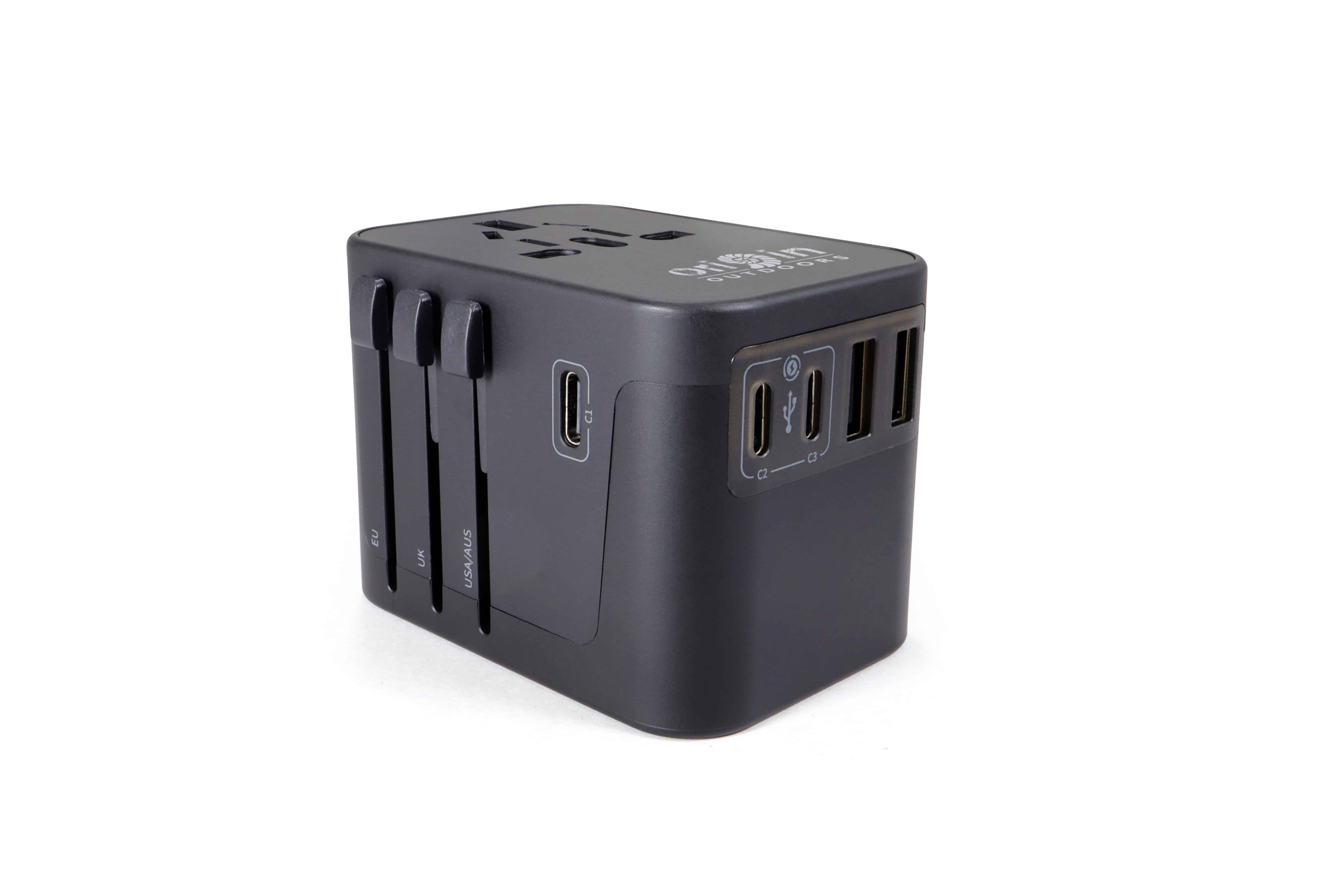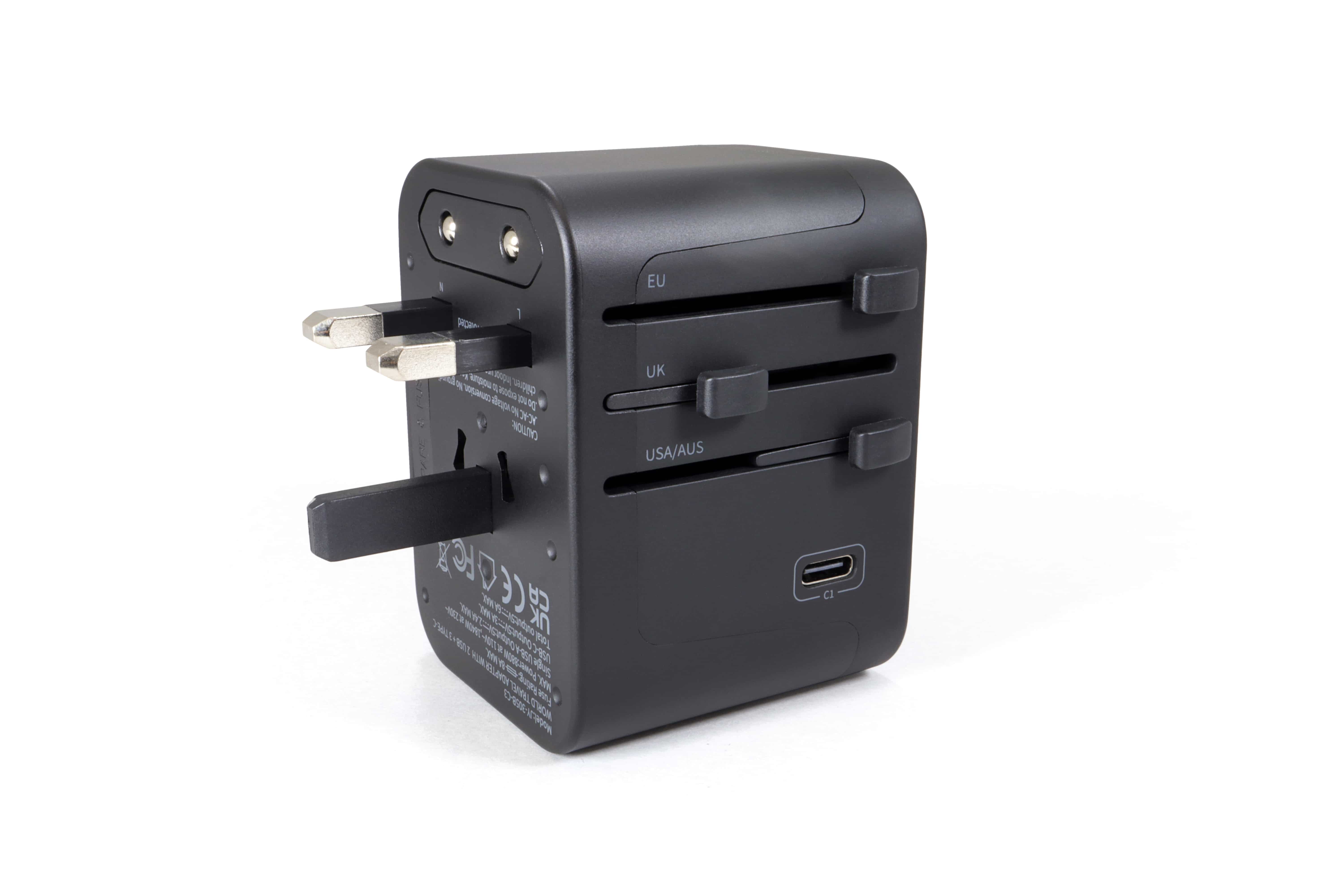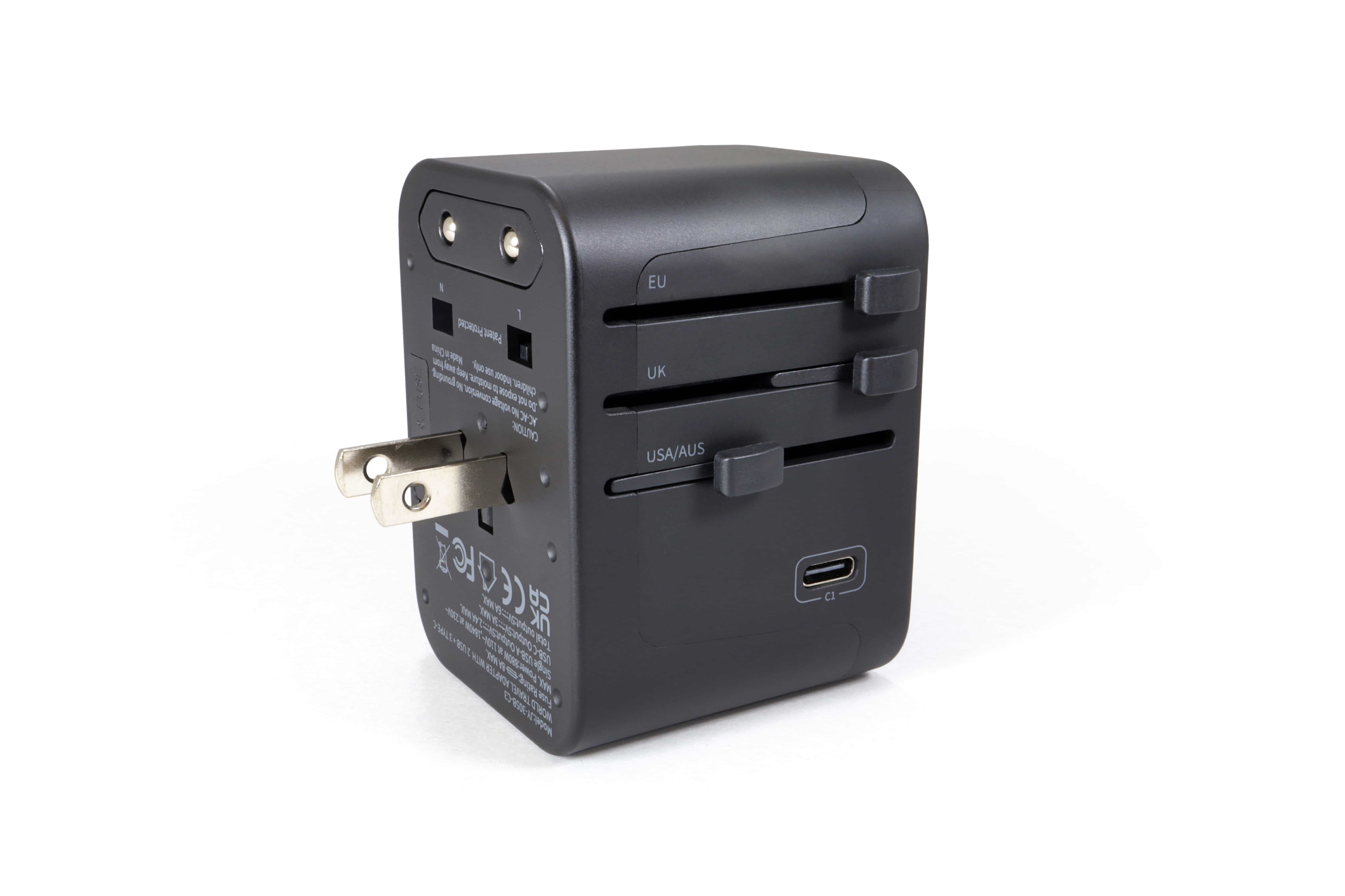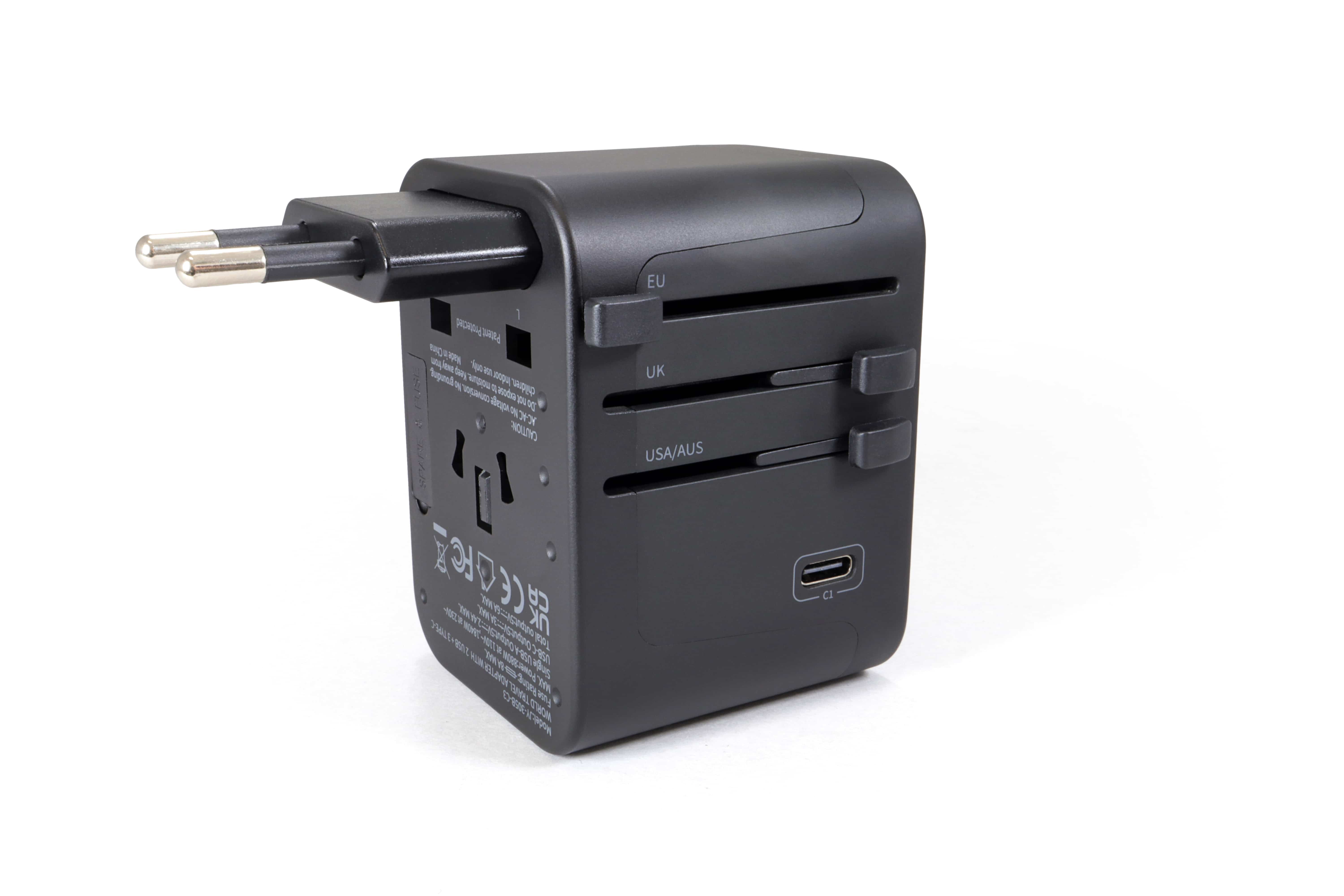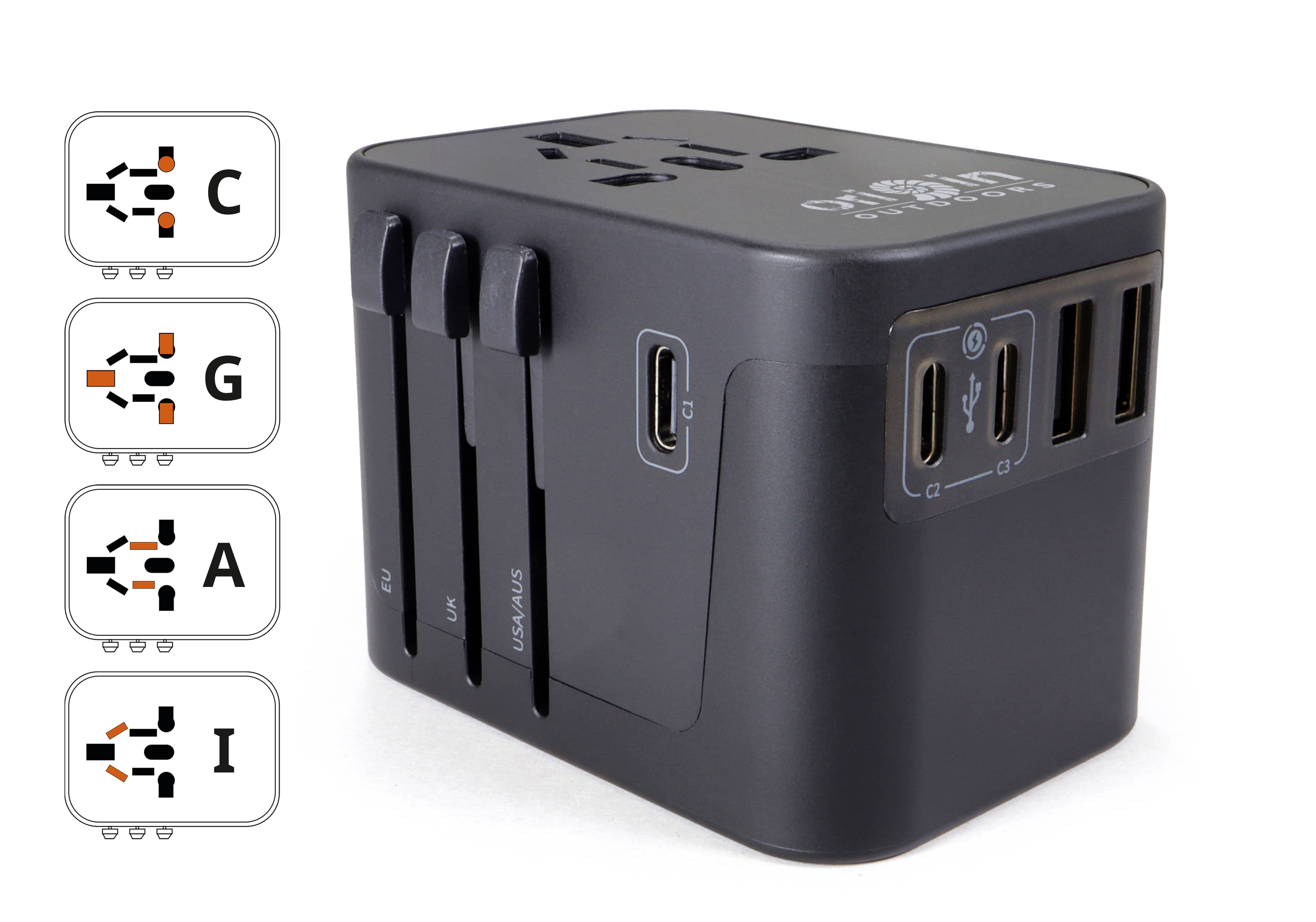 Der Universalsteckadapter für Weltenbummler mit 5 USB-Ausgängen (2 x USB-A / 3 x USB-C). Dank 4 verschiedener Steckertypen ist er für über 200 Länder geeignet (z. B. USA / GB / Australien / China, etc.). Mit den 3 seitlichen Schiebern und der Entriegelungstaste lässt sich der richtige Netzstecker des jeweiligen Landes schnell und einfach auswählen. An den USB-Anschlüssen können Geräte direkt aufgeladen werden, wie das Handy, Tablet oder die Powerbank. Der Adapter verfügt über eine austauschbare 8-Ampere-Sicherung und das Gehäuse ist aus feuerhemmendem Polycarbonat gefertigt. Die Steckereingänge sind mit Schutzklappen ausgestattet, welche automatisch schließen, wenn kein Stecker angeschlossen ist. Eine Ersatzsicherung und der Transportbeutel sind im Lieferumfang enthalten.