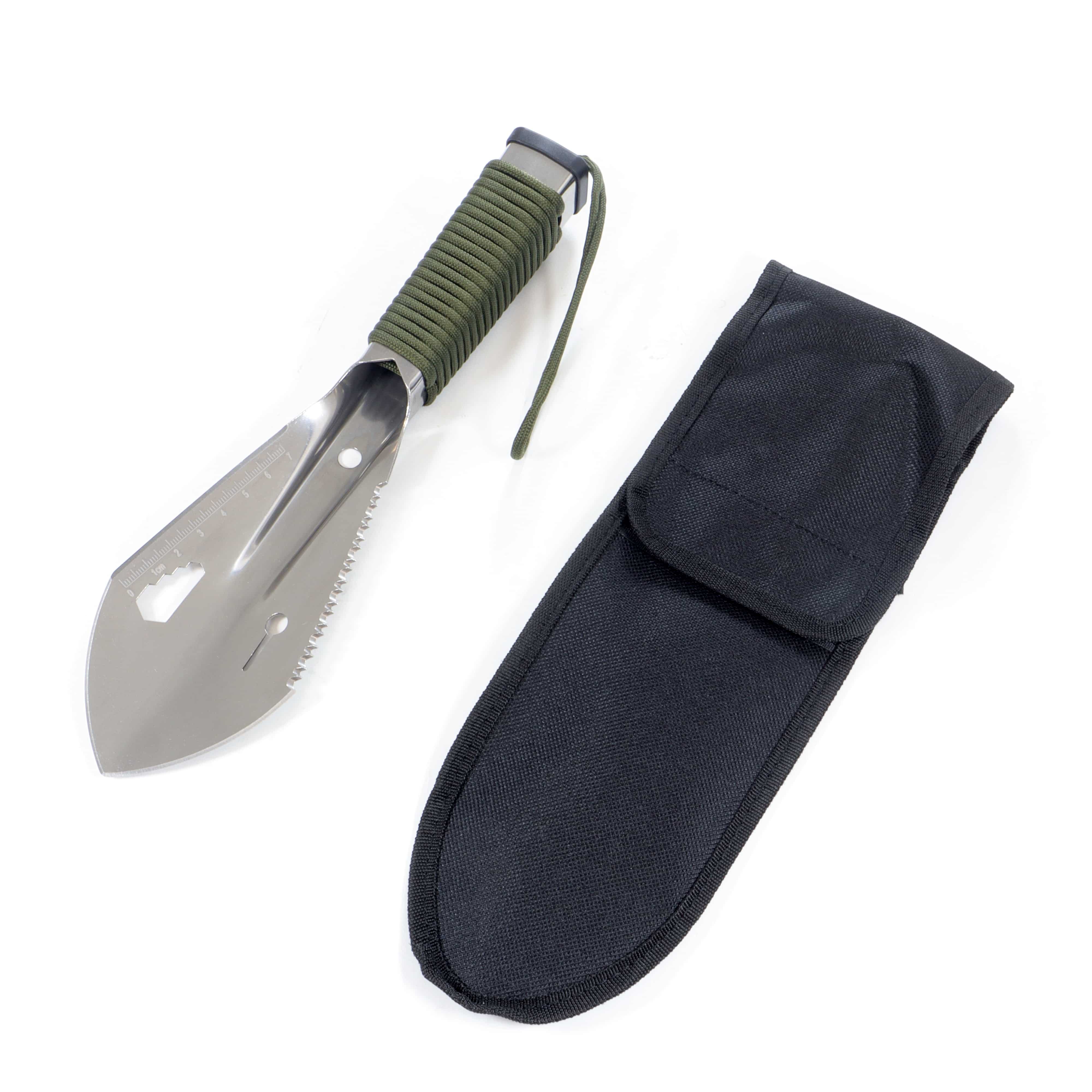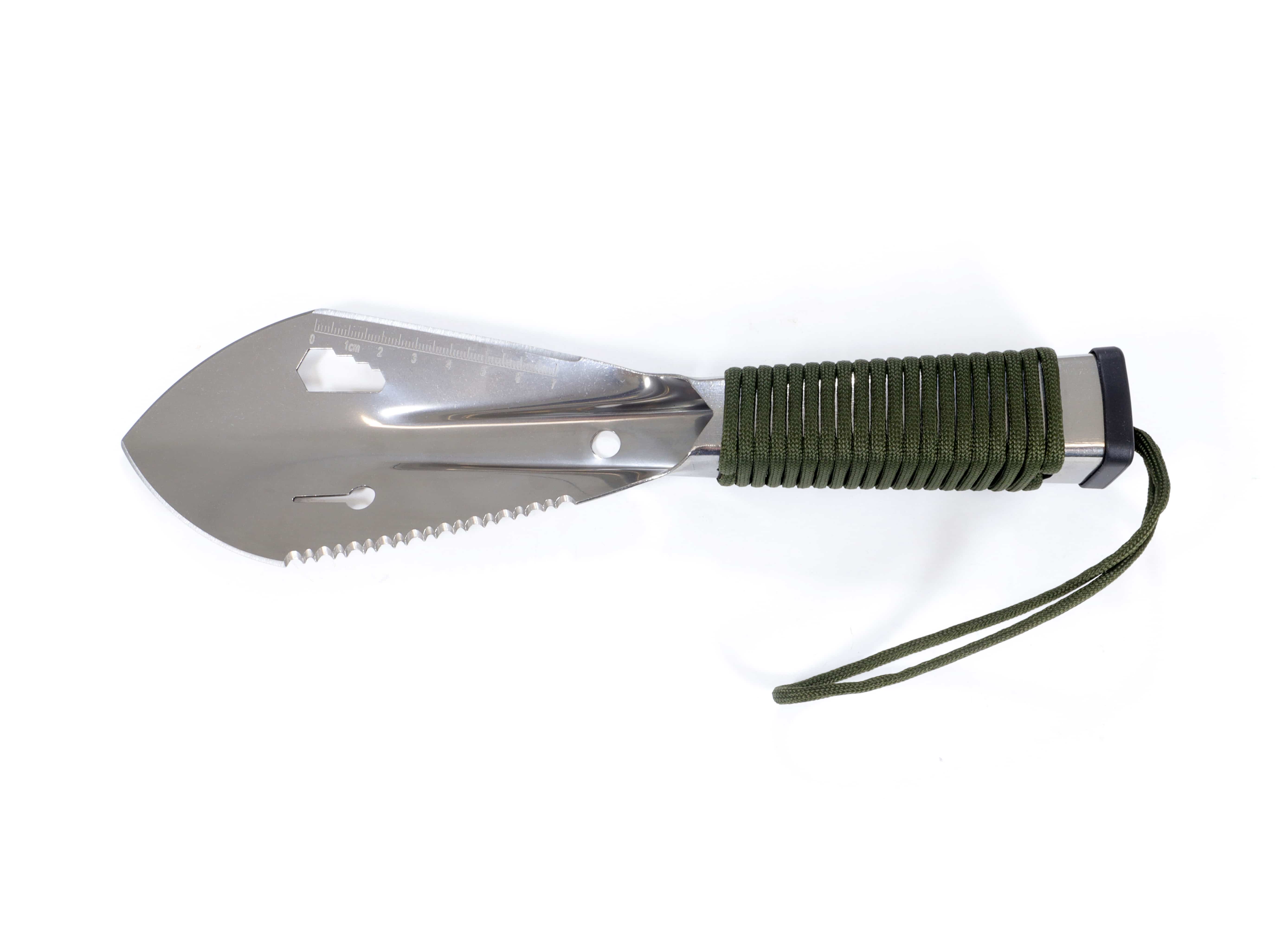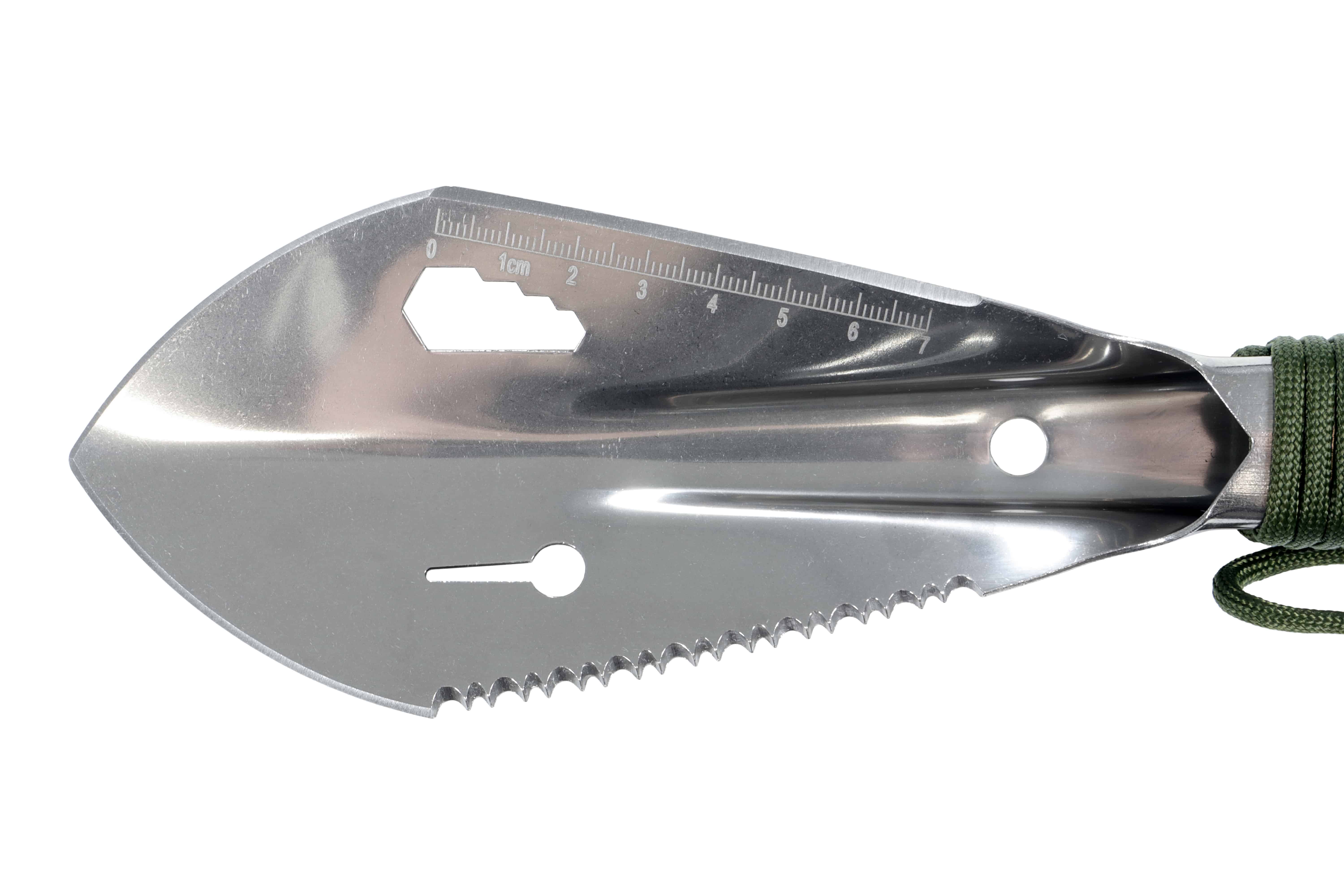Die kleine und handliche Schaufel ist ein äußerst praktischer Begleiter bei kleineren Trekkingtouren durch die Natur. Mit über 7 Funktionen kann die Schaufel sehr vielseitig eingesetzt werden. Die Funktionen sind: Schaufel, Nagelzieher, Messer, Säge, Schraubenschlüssel und Lineal. Gefertigt aus hochwertigem Messer Edelstahl ist die Schaufel sehr beständig gegen Rost. Der Griff ist mit einem 3 Meter langen und für Notsituationen sehr nützlichen Paracord umwickelt. Mit praktischer Handschlaufe und im Lieferumfang enthaltener Nylontasche.