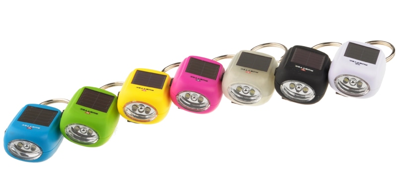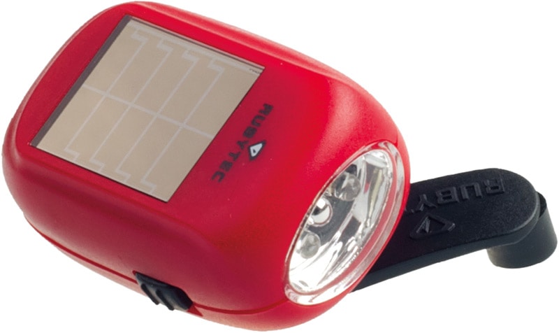 Superkompakte Taschenlampe mit Solarpaneel und Handkurbel für die 100%ig-Batterie-unabhängige Stromversorgung. Eine Minute kurbeln bringt drei Minuten Licht. Zwei LEDs mit Reflektor für sparsamen Betrieb und gute Helligkeit. Mit Schlüsselring.