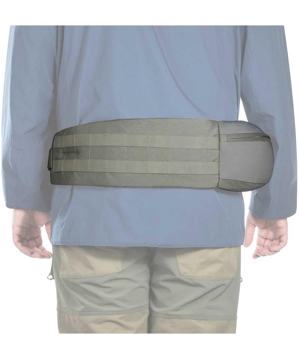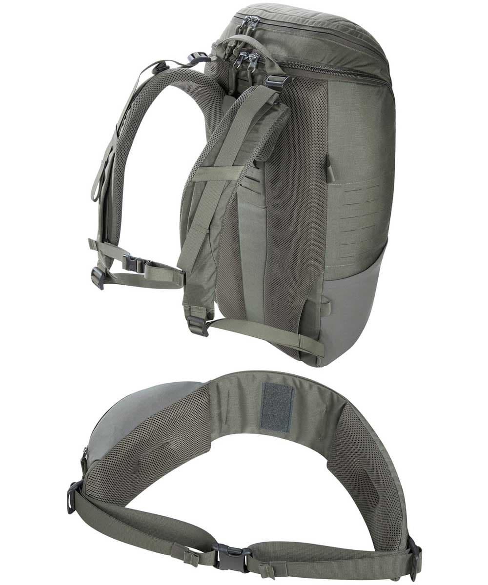 - Der Hüftgurt des Rucksacks ist auf der einen Seite mit einer Reißverschlusstasche und auf der anderen mit Matrialschlaufen ausgestattet. Du kannst ihn abnehmen und separat als Gürtel für deine Ausrüstung verwenden, wenn du einmal nicht soviel mitnehmen willst.